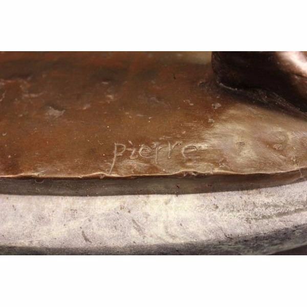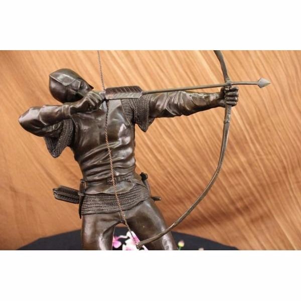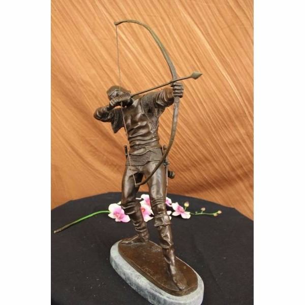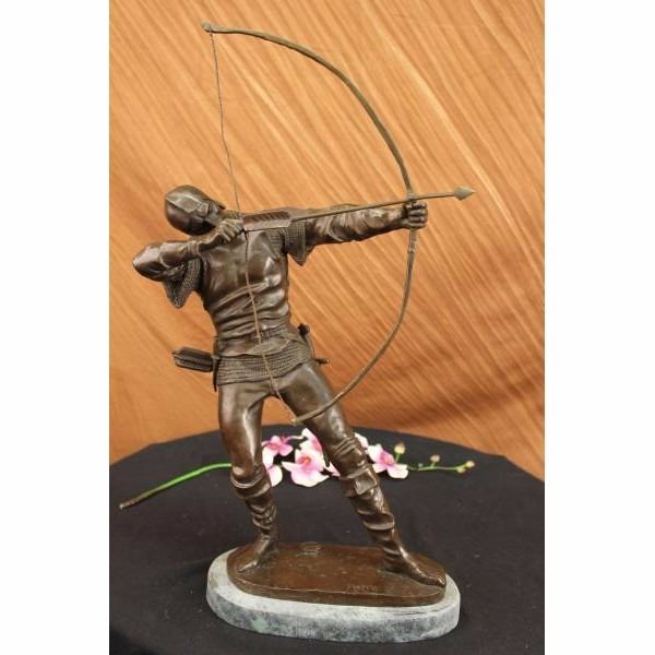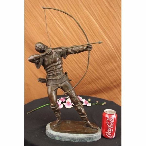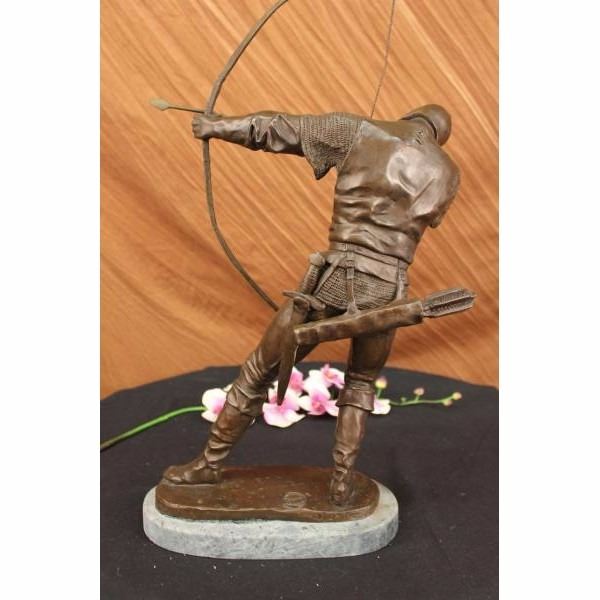 A fierce ancient European warrior spots a enemies from the distance. He takes aim, raises his bow, squints an eye and pulls back. He is dressed in his warrior clothes, pants, long boots, and a long sleeve shirt. A quiver of bows is slung on his waist His sword hangs from beneath his legs, and he has a little knife on one side of his waist belt. The pointy arrow is parallel with his perfect posture. 100% bronze and handmade,this brown patina sculpture was cast using the "Lost Wax Method" and mounted on a green marble base. It is signed by the artist Pierre. Condition: This sculpture is in perfect condition. Bronze Dimensions with Marble Base:Height 23" x Width 13" Marble Dimensions: Diameter 11" . Height without base: 22" Weight : 17 LBS Inventory:45X22437454