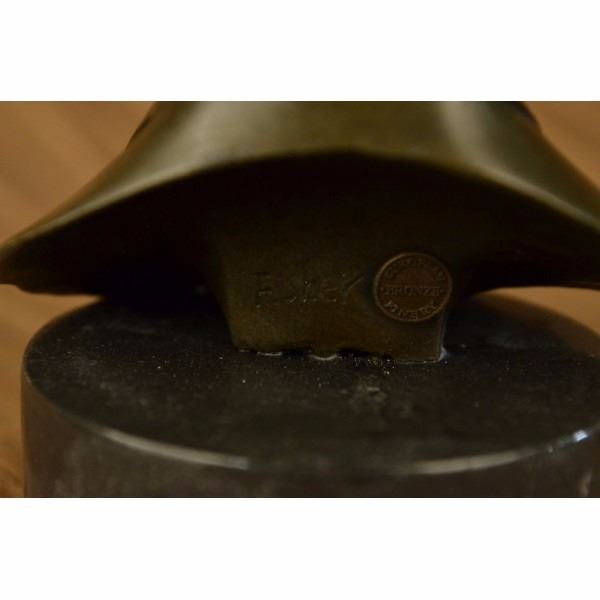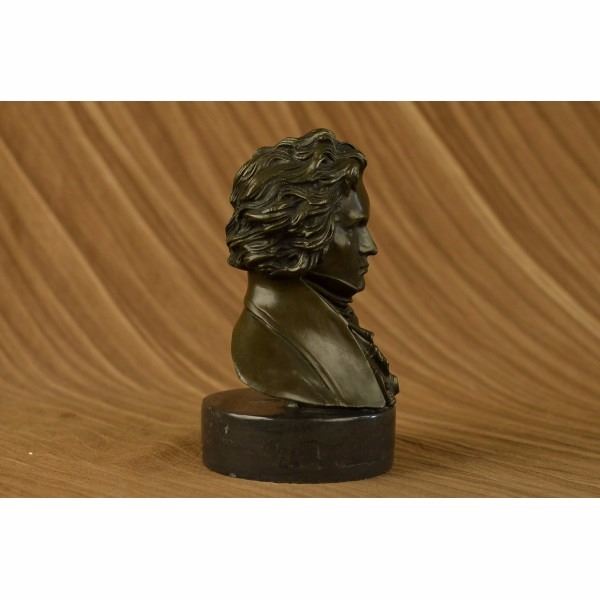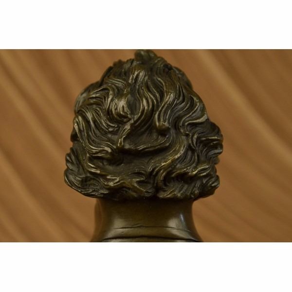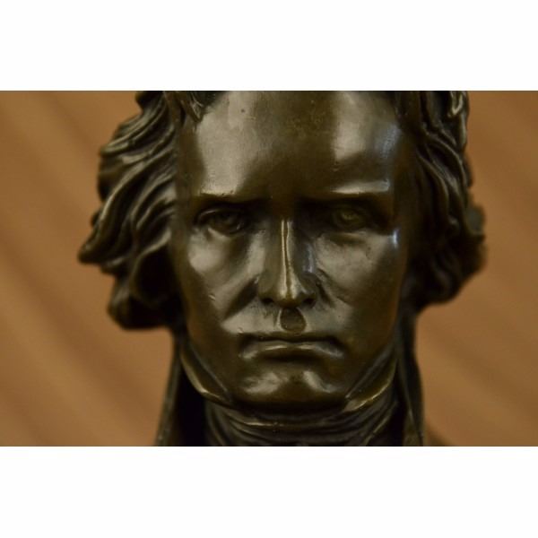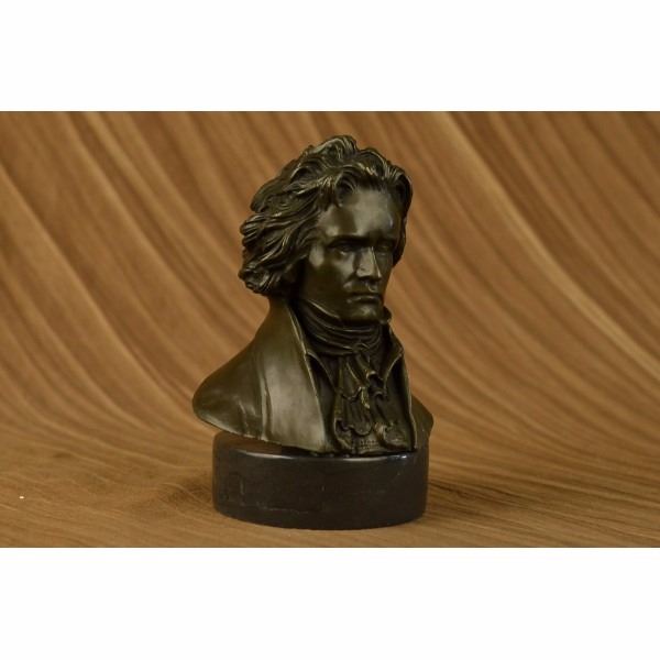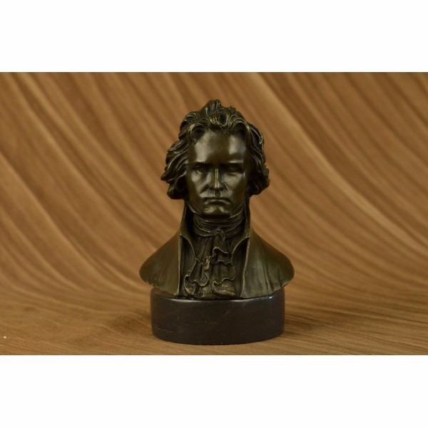This beautiful bust of Beethoven is dressed in his full attire. He looks as if he is perplexed so he steps outside to smoke his pipe. His scroll of music sits next to him waiting for the next masterpiece to be written. He has strong facial features. You can see these details in the forehead, nose, cheek, and chin. His jacket is quite unusual with a side tie and a large folding collar. It is quite a classy sculpture and this sculpture will be sure to add a touch of class to any space in your home. This Bronze Sculpture was casted using the "Lost Wax Method". It has a brown patina and is mounted on a marble base. This bronze sculpture is the perfect gift to give to a pianist and is signed by artistFisher. Condition: This sculpture is in perfect condition. Bronze Dimensions with Marble Base:Height 8 1/2" x Width 6" Marble size: Diameter 5" Height without base: 7 1/2 " Weight : 8 LBS Inventory : 53 Y798343 5
