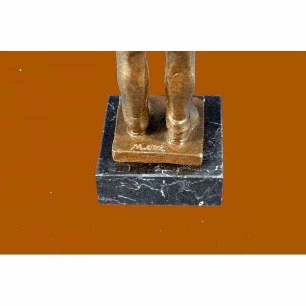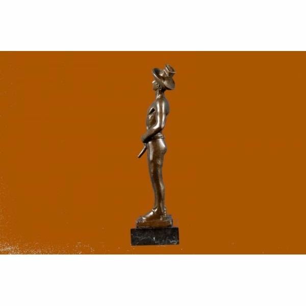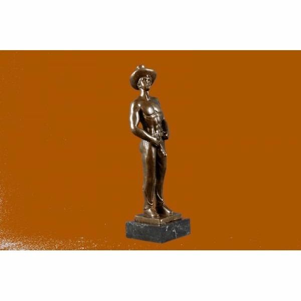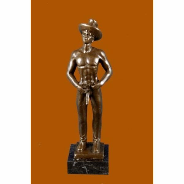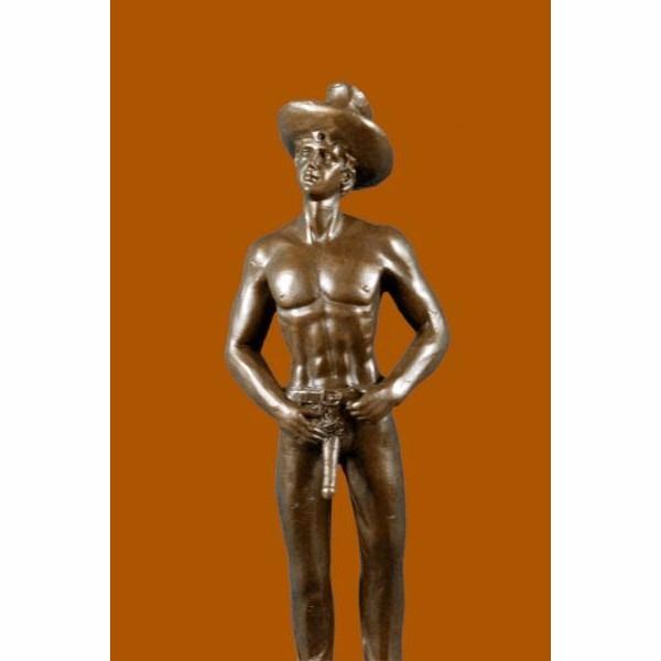 This sculpture of a cowboy wearing nothing but a belt. exposing his private area and not having a care upon his face instead he smirks in disbelieve that he is posing in front of a camera basically nude. He stand in his cowboy hat and cowboy boots and his face looks as if he's is dieting to laugh in the inside. He holds his package as he was told to do. This is a beautifully detailed sculpture and depicts the way of a dirty cowboy fantasy life should be. This sculpture was cast using the Lost Wax Method and is signed by artist M. Nick Condition : This sculpture is in perfect condition. Bronze Dimensions with Marble Base:Height 12" x Width 4" Marble Dimensions: 4" X 4" . Height without base: 11 " Weight : 6 LBS Inventory : 72XN14245427
