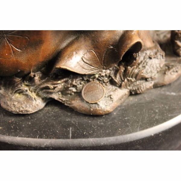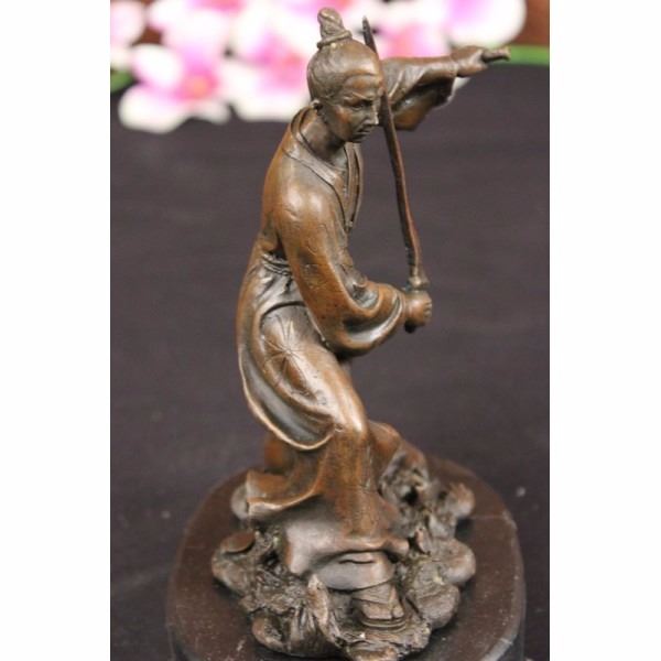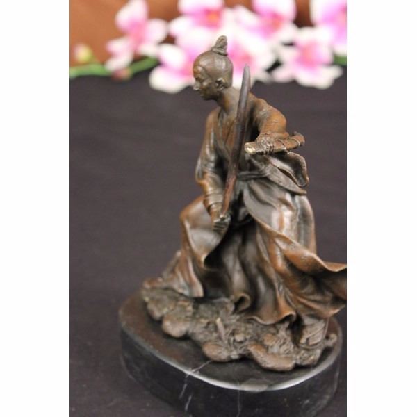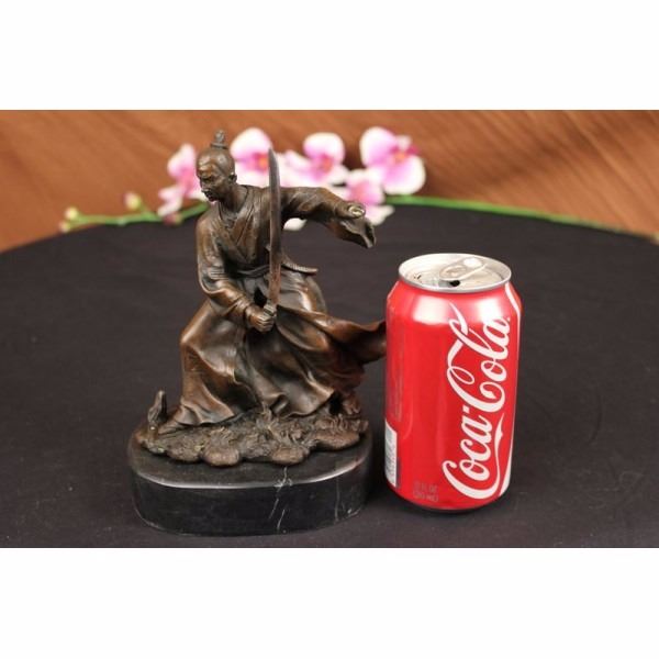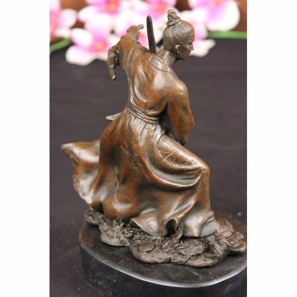 This Asian man is doing his normal routine, as he practices hisMartial Arts with his sword. As steady as he can be, he takes his time making sure he does not make any mistakes. In Martial Arts its all about consistency and patience, without one or the other it is impossible to keep all the work you put into it well done. He is wearing a long robe that ties around his waist and has these beautiful flower decoration all around it. His hair is tied slick back into a high neat bun, to make sure he does not get any hair in his face while he practices. This sculpture was cast using the ancient old "Lost Wax Method" stained in brown patina finish for preservation, mounted atop a black marble base and is signed Kamiko. Condition: This sculpture is in perfect condition. Bronze Dimensions with Marble Base:Height 8" x Width 5" Marble Dimensions: diameter 5" . Height without base: 7" Weight : 7 LBS Inventory 97DS0983679
