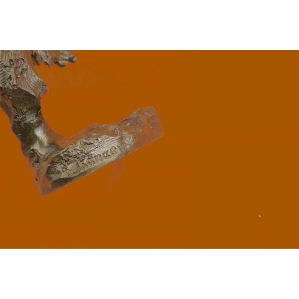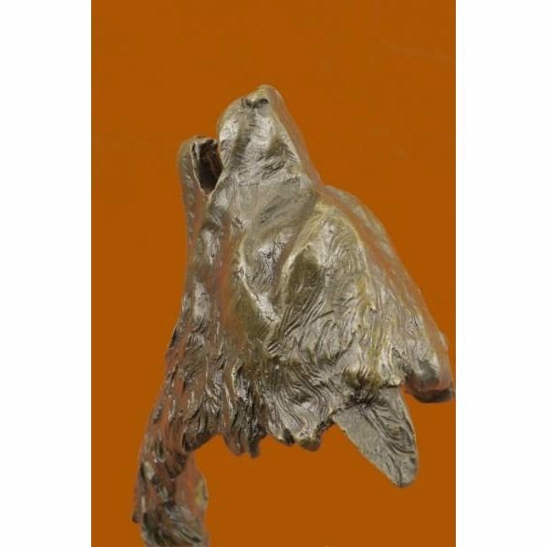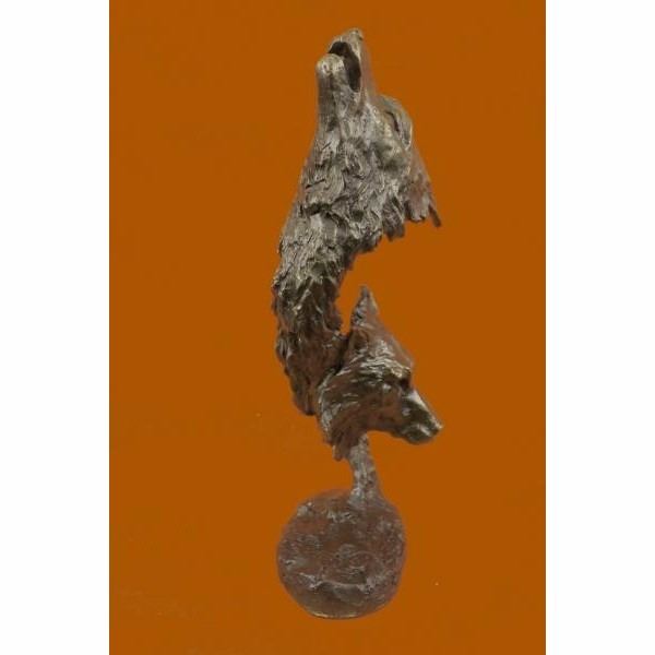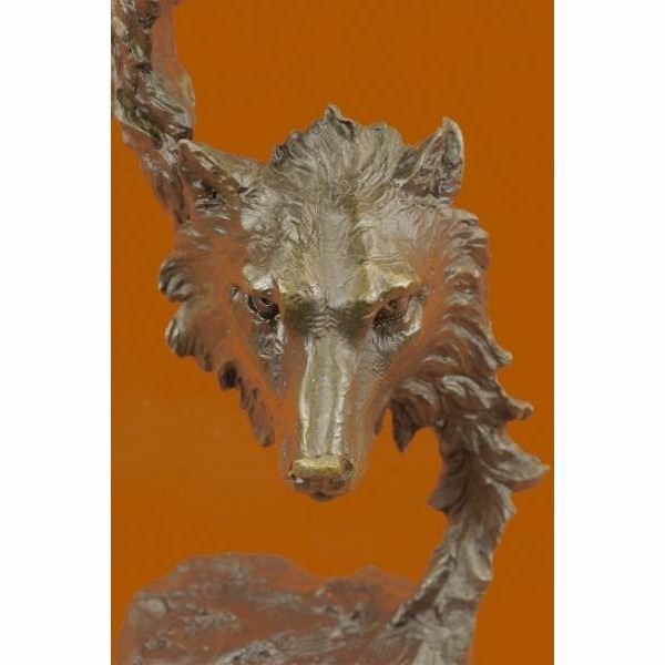 When people think of wolves they think of their lethal hunting skills, howling and the pack. The creation of a wolf family is unique for animals. Wolves are social predators that live in nuclear families consisting of a mated pair, offspring and occasionally adopted subordinates. They are a loyal bunch, protecting and providing for one another. This beautiful bust sculpture depicts two mated wolves, side by side. They resemble one another closely but one is slightly larger. Their ears perk and their sharp eyes gaze. Careful attention to the detail of their coats was paid. Their beautiful coats are rugged and blow in the wind. You can feel the roughness of their coats with a single touch. They seem to blend into one another to become one, as a pack would. 100% bronze and handmade,this dark brown patina sculpture was cast using the "Lost Wax Method" and mounted on a marble base. It is signed by the artist Kanaev. Description Condition : This sculpture is in perfect condition. Bronze Dimensions :Height 12.5" x Width 5" Weight : 6 LBS Inventory : 78DW1104987
