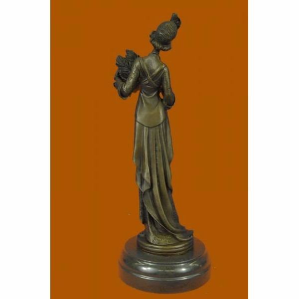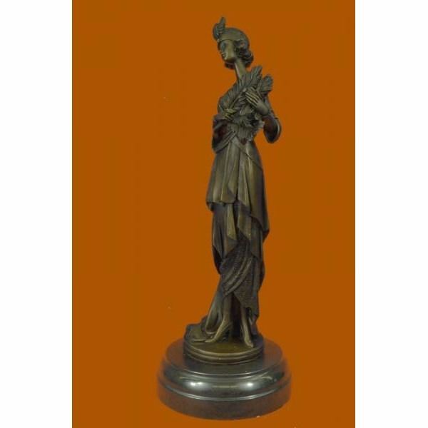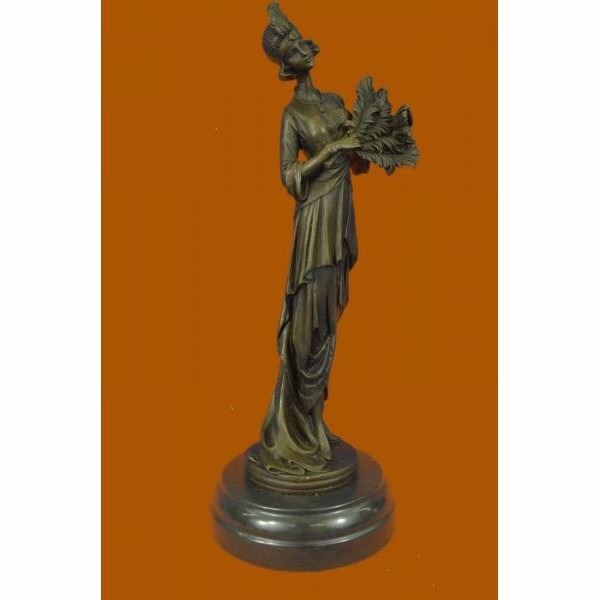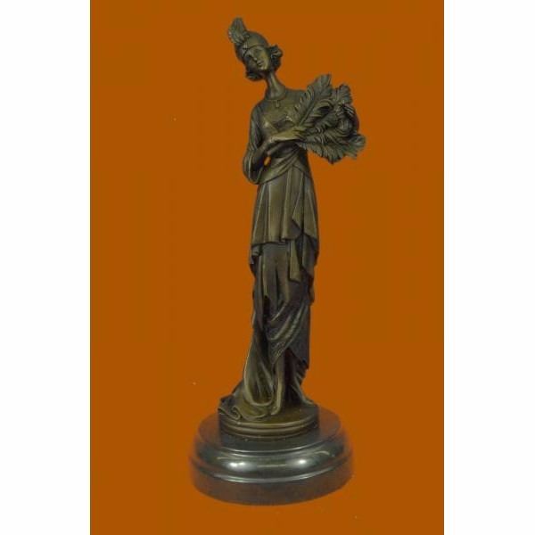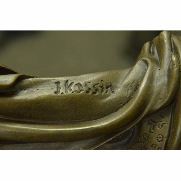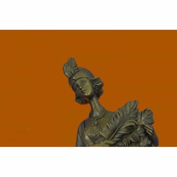 This unique sculpture of a 1920's woman with four feathers in her right hand standing proudly for the silent era. Her unforgettable dress that drops all the way to the floor from the back, while the front shoes some legs and has so many pretty layer to it. The details on the neck-less, bracelet, and Charleston head band are unbelievably carved perfectly. This is a beautiful bronze sculpture cast using the "Lost Wax Method" and has a gorgeous brown patina. It is mounted on a marble base and is 100% bronze and handmade. This sculpture is signed by the artist J.Kassin. Condition: This sculpture is in perfect condition. Bronze Dimensions with Marble Base:Height 14" x Width 5" Marble Dimensions: Diameter 5" Height without base: 13" Weight : 8 LBS Inventory:73YRD1292433