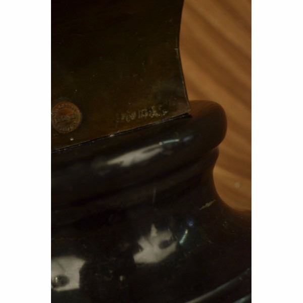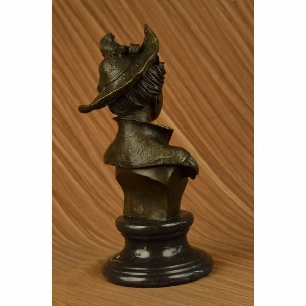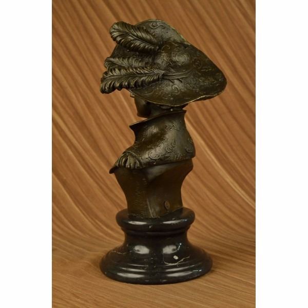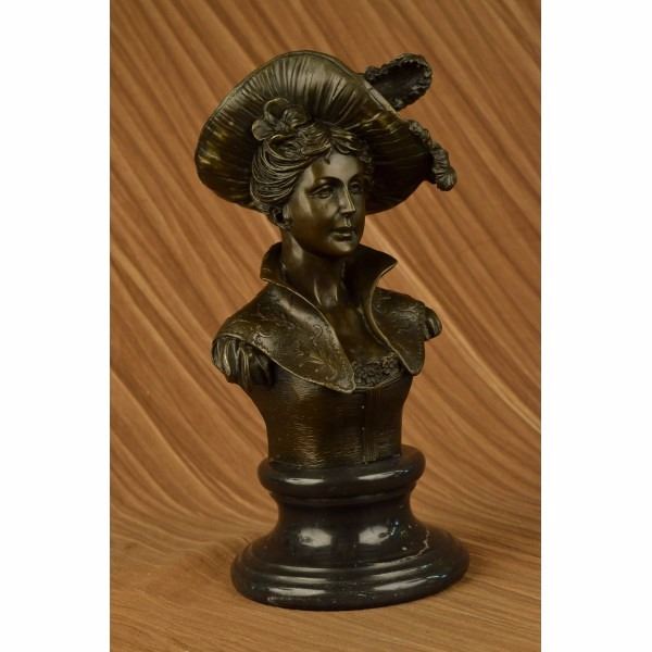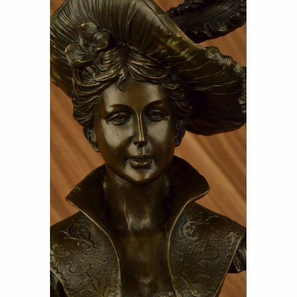 This is an amazing bust of a young woman from the 1900's. She has a gorgeous hat while her hair is up in a unique style. She is wearing a corset that's extremely tight and a high collar blazer that suits her beautifully. Her beauty is divine, her face features are spectacular and she looks like a little doll. This sculpture was cast using the ancient old "Lost Wax Method" stained in brown patina finish for preservation. 100% handmade and 100% bronze, mounted atop a black marble base and signed by the artist Thomas. Condition: This sculpture is in perfect condition. Bronze Dimensions with Marble Base:Height 17" x Width 9" Marble Dimensions:Diameter 9" Height without base:13" Weight :17 LBS Inventory : 13Y9868031