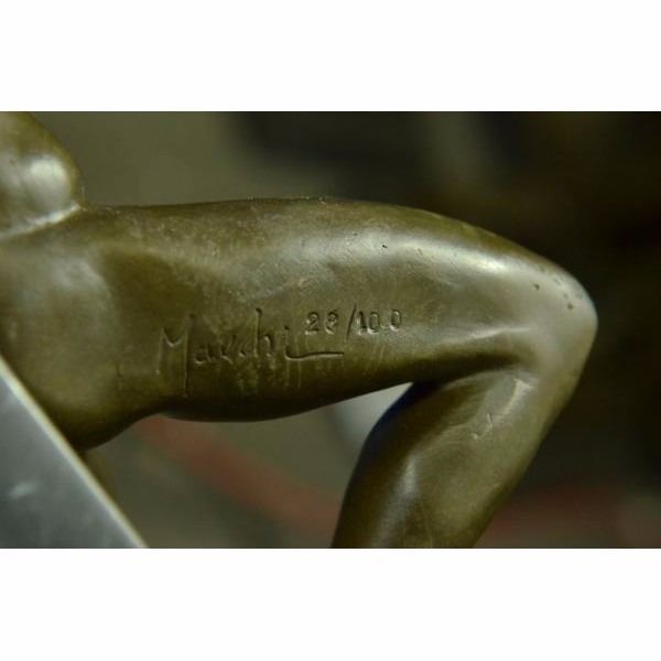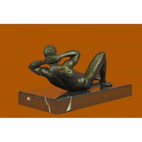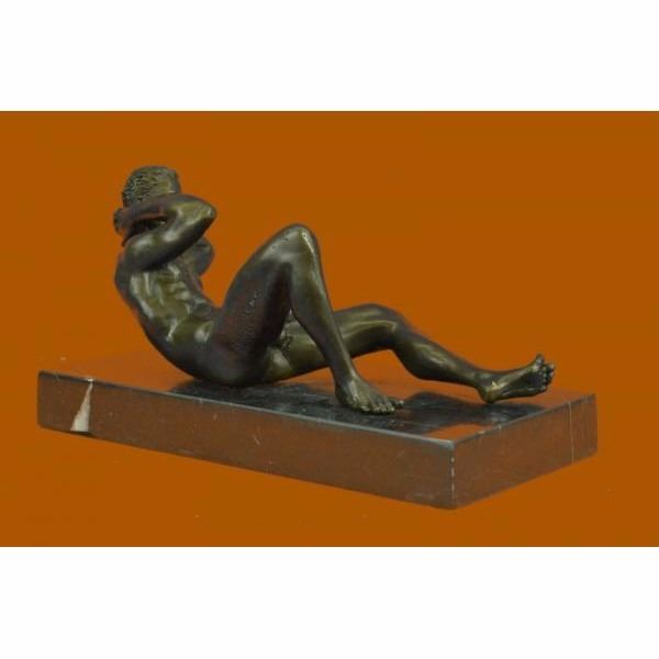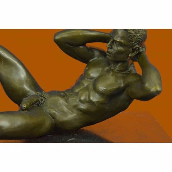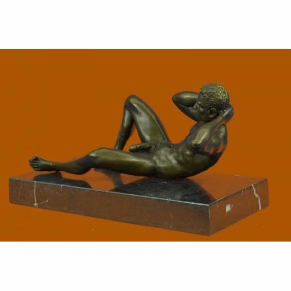 He stares back at you seductively. He lays casually on the bed,exposing his amazing body. His intense eyes dare you to touch him. This proud gay man stretches his muscular arms behind his head and poses for his admirers. He is a lean and muscular model. Take a gander at his chiseled torso and chest. Please try not to faint. He would be right at home at New York's Chippendale's and would drive all the guys and dolls mad with desire. There is something sexy but soft about him. Seductive but intimidating. Warm but burning hot. He can provoke an assortment of emotions in anyone. Let him bring out your erotic desires. This confident stud was cast using the "Lost Wax Method". 100% handmade bronze and carefully detailed this is a priceless unlimited edition piece of work and is signed by artist Mavchi. Condition: This sculpture is in perfect condition. Bronze Dimensions with Marble Base:Height 6" x Width 10" Marble Dimensions: 10" X 5" Height without base: 5" Weight : 9 LBS Inventory : 17ST0874771