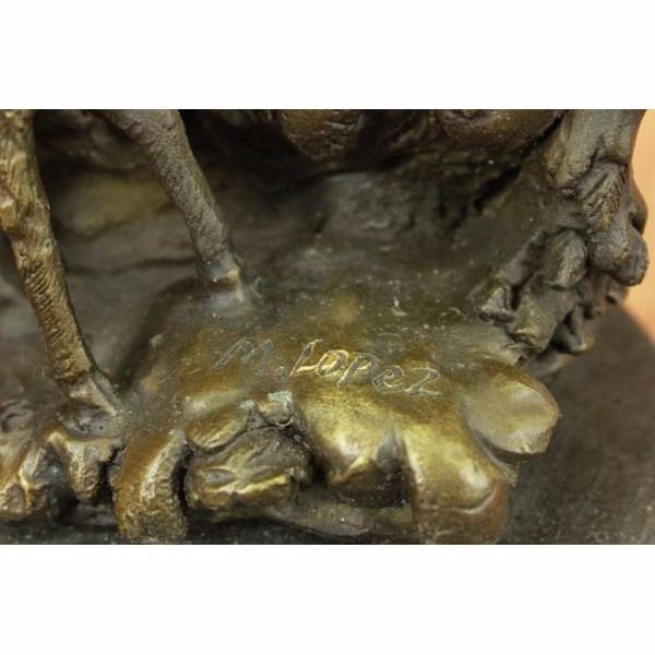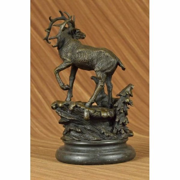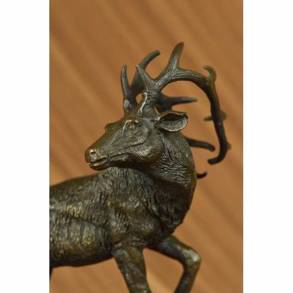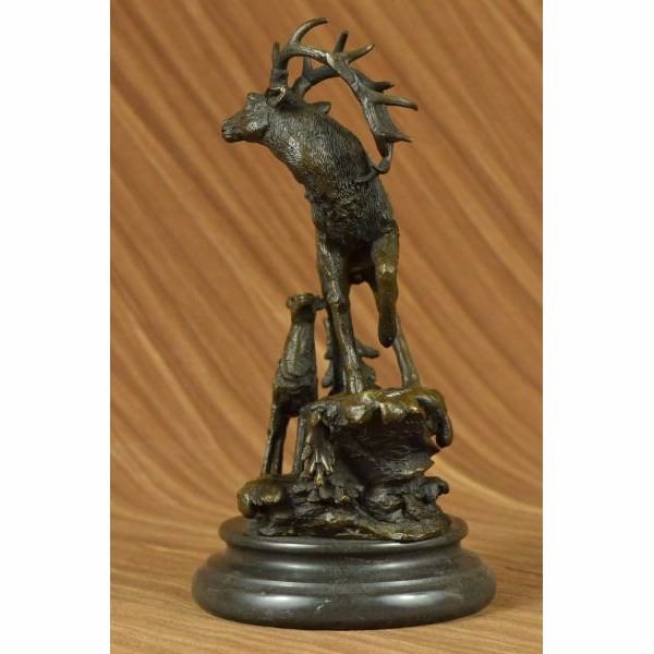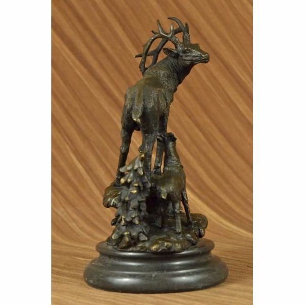The male deer comes down the forest's edge offering a series of vocalizations for the mountains to echo across the sky and lands with his baby. He seems as though he is on a mission to find food for his baby. His crown of tall antlers will be used to for sparring (antler wrestling) with another male to gain the rights of dominance locating food. The handmade bronze sculpture was cast using the age-old method of lost-wax casting and stained with a brown patina finish for perpetuation. He is mounted upon a black circular marble base and is signed by artistM.Lopez. Condition: This sculpture is in perfect condition. Bronze Dimensions with Marble Base:Height 11" x Width 9 " Marble Dimensions: Diameter 6" Height without base: 10" Weight : 10 LBS Inventory : 14YDW1274541