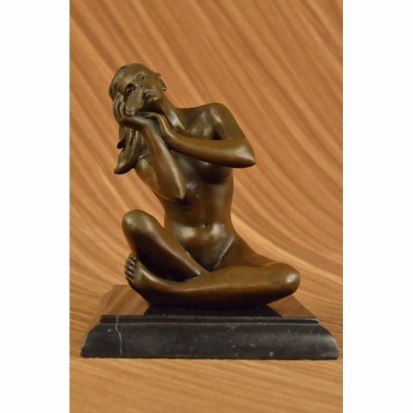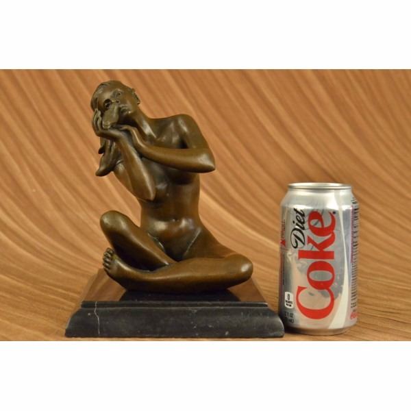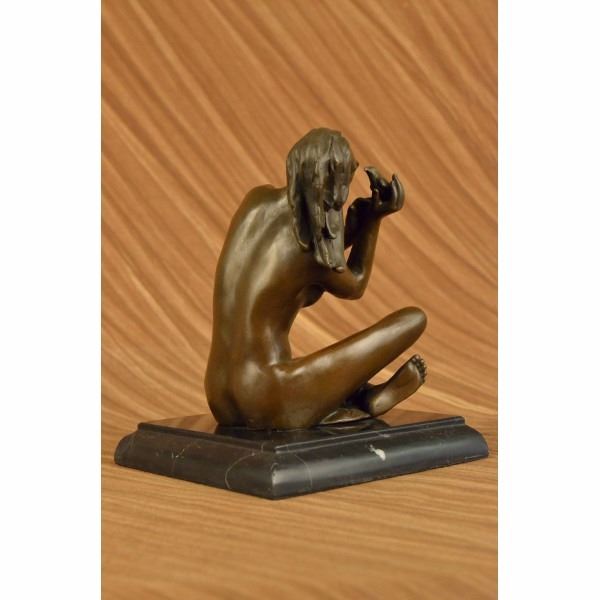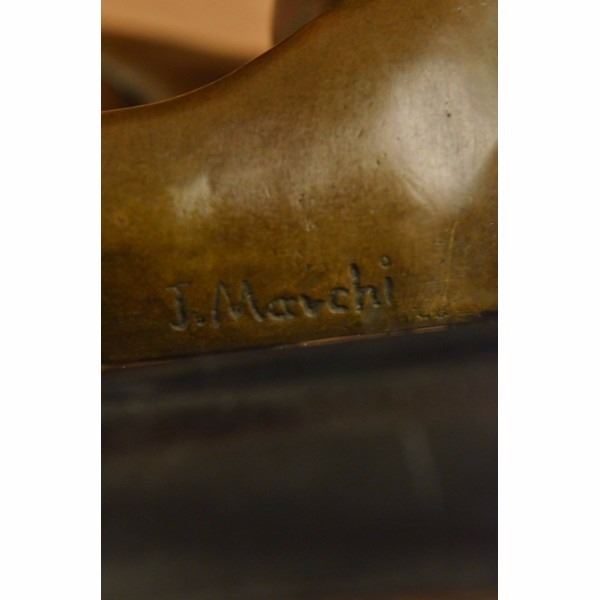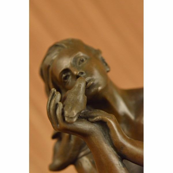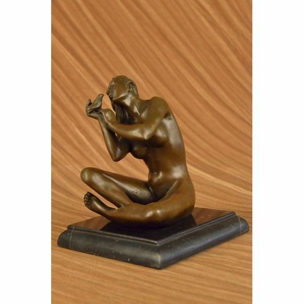 Superb real bronze nude signed Mavchi depicts a beautiful lady tenderly holding her bird. She's beautifully sculptured from all angles of view. The detail and composition are excellent. She actually looks alive. The bronze is inscribed Mavchi and is mounted on its original marble pedestal base. The bronze is in excellent condition. Condition: This sculpture is in perfect 8" x Width 7" Marble Dimensions: 7" X 7" Height without base: 7" Weight : 10 LBS Inventory: 25DS5645352