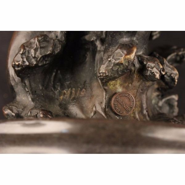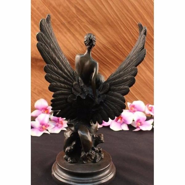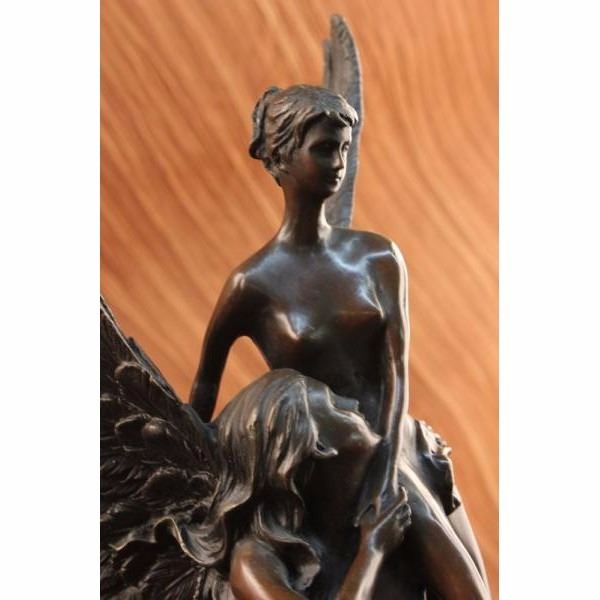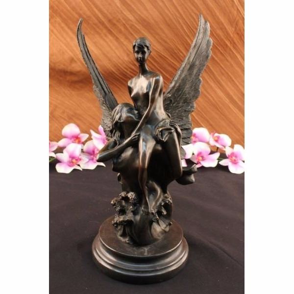 This lovely sculpture of an angel rescuing another woman. Part of the reality of life is hardship. That is not a negative statement. It is simply a statement of fact. Every day brings new challenges. Living with the expectation that life will be difficult makes hard times easier to deal with. When a family encounters hard times they will need to join together and face the challenge as a team. They will need to be sensitive to the needs of individual family members each of whom will face unique difficulties. Life is not easy, but having a support system makes life that much easier.This sculpture relates to hard troubles because it shows that an angel is always by your side to lift your spirits. 100% bronze, handmade and fully detailed. This sculpture was castusing the "Lost Wax Method" and is mounted on a circular black marble base and is signed by artist Milo. Condition: This sculpture is in perfect condition. Bronze Dimensions with Marble Base:Height 14" x Width 8" Marble Dimensions: Diameter 5" Height without base: 12" Weight : 13 LBS Inventory : 62Y3936126
