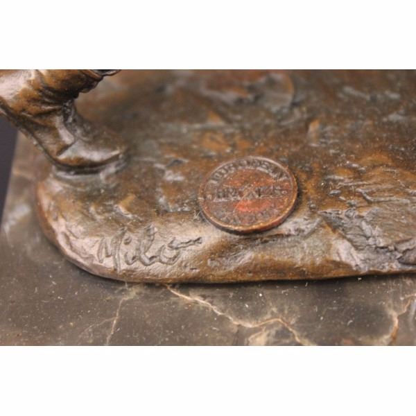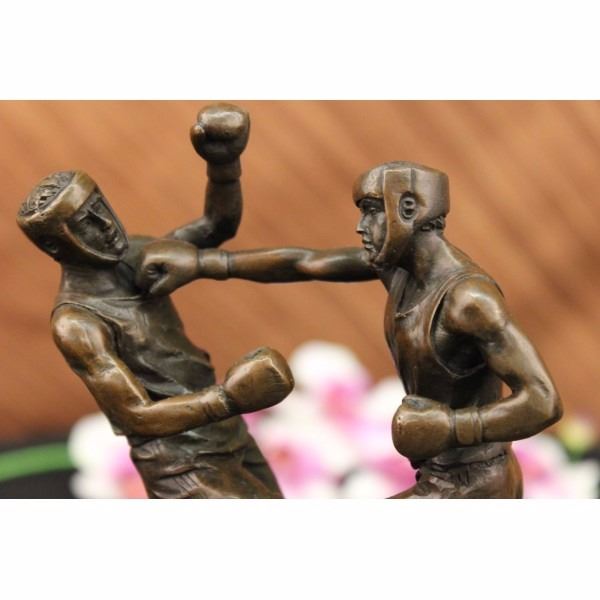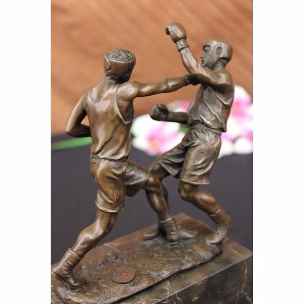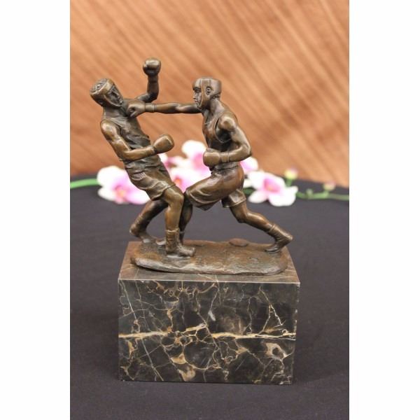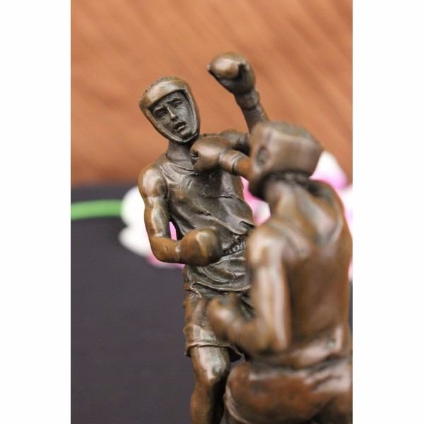 It is the last round of the match and the odds aren't looking good for one box. He steps back in reaction the stiff punch that has just hit his jaw. The adept boxer is weary yet he powered through to come out as the winner of this match. This athletic sculpture was crafted using the lost wax method. It rests on a high dark brown marble base and is signed by artist Milo. Condition : This sculpture is in perfect condition. Bronze Dimensions with Marble Base:Height 9" x Width 5" Marble Dimensions: 5" X 3" Height without base: 6" Weight :9 LBS Inventory : 31B7703913