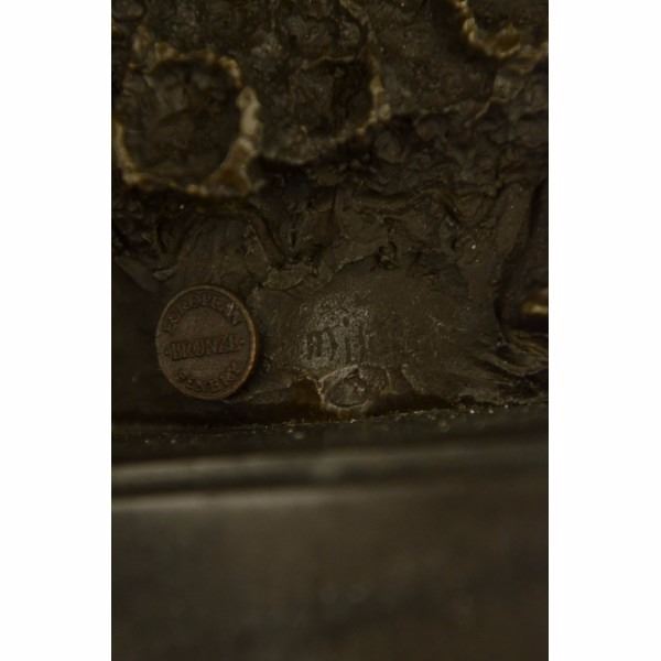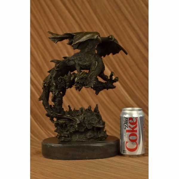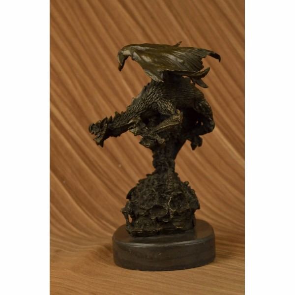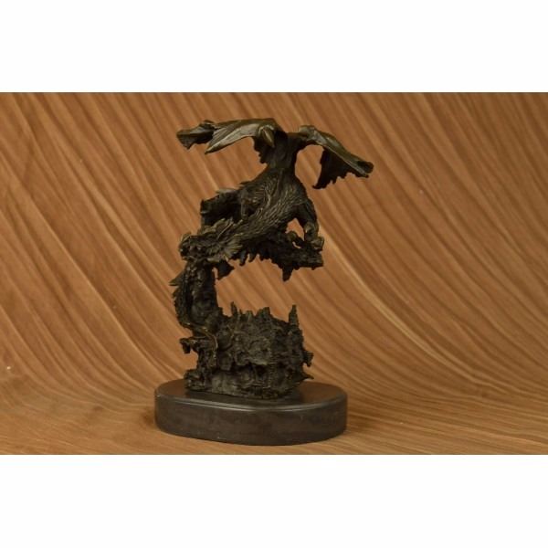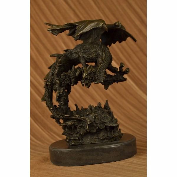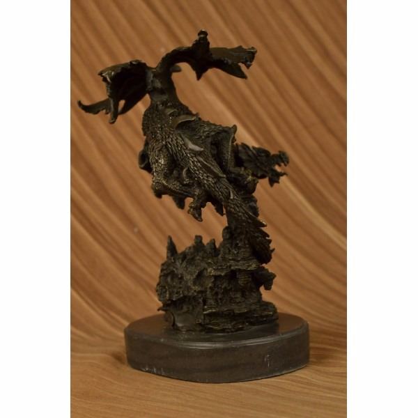 This dragon is a beast of mythical proportions. One can see the strength in its wings and claws. Her body is covered in protective scales and plates. She is perched high up in a cave, her tail swinging back and forth below her, just waiting for someone to attack her. Her mouth is open to show her fangs to anyone that may come too close. She defends her territory with a fierceness you can only find in old tales of one knight's foolishness to go up against such a magnificent creature.100% bronze and handmade, this sculpture was cast using the "Lost Wax Method" and mounted on a marble base and is signed by artistMilo. Condition: This sculpture is in perfect condition. Bronze Dimensions with Marble Base:Height 13" x Width 11" Marble Dimensions:Diameter 8" Height without base: 12" Weight : 20 LBS Inventory : 43Y6428934