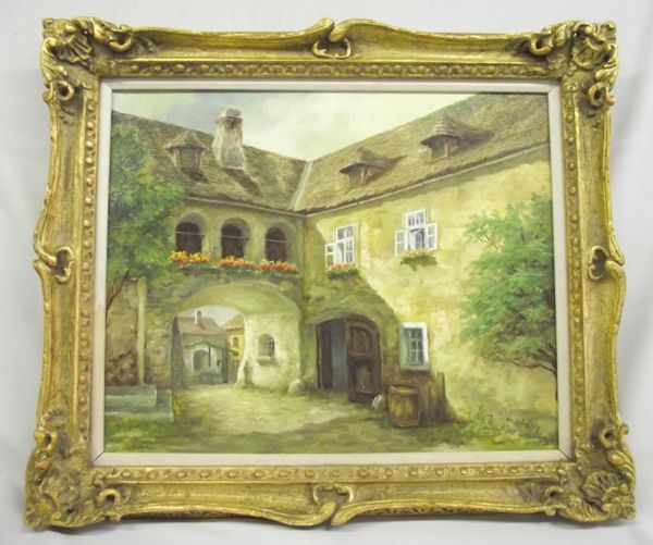 Signed Original Oil on Canvas- M. Schony (Germany B-1913) depicting a European courtyard. Framed. Condition: excellent. 16'' x 20'' (20-1/2'' x 25'')Circa: Mid/Late 1900s. Ready for hanging.