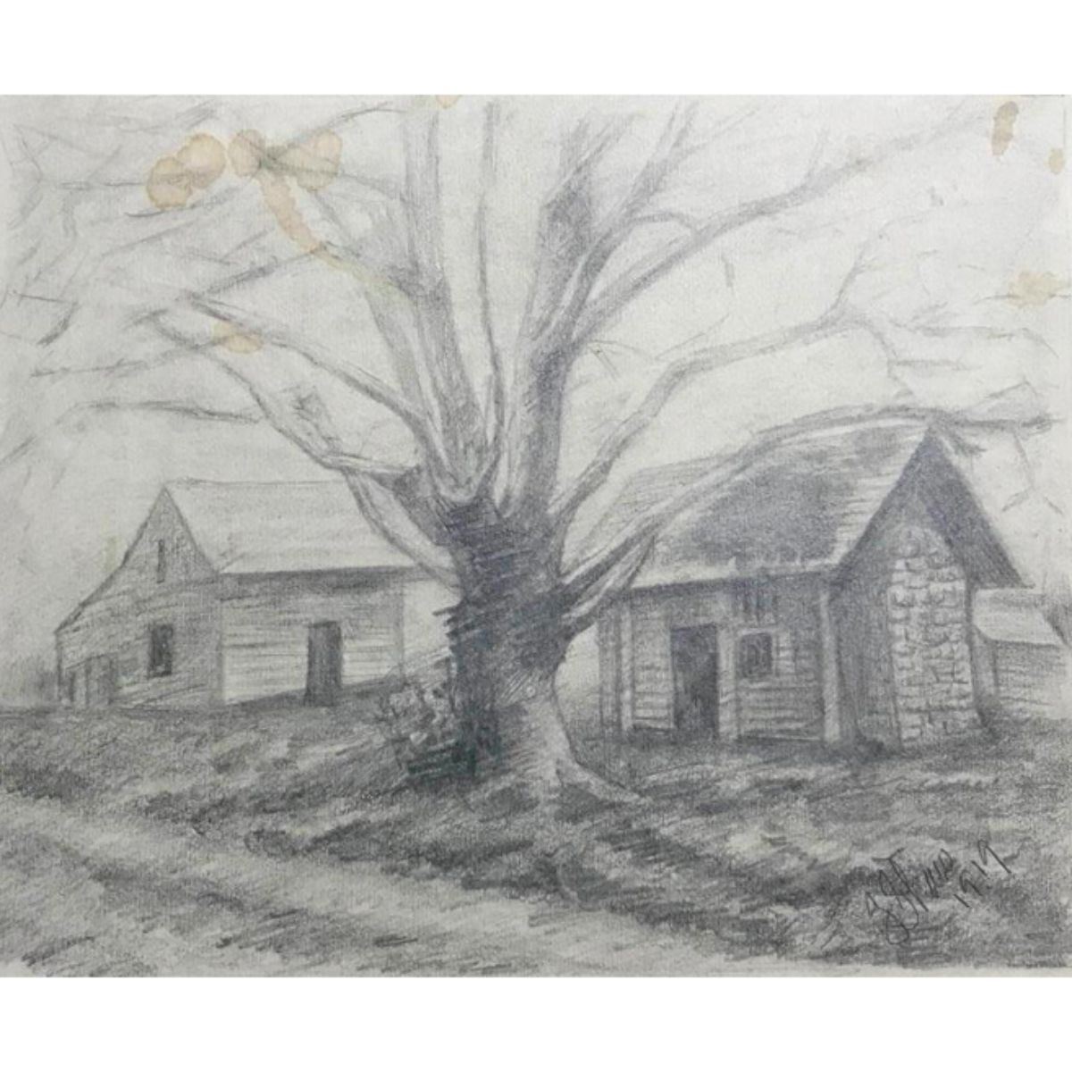 Signed S. Shaw 1919 pencil sketch of slave cabins. 8" X 10" image on 12" X 14" heavy paper. * creasing to a portion of the top right, scattered stains across top, lowered reserve reflects damage.Â