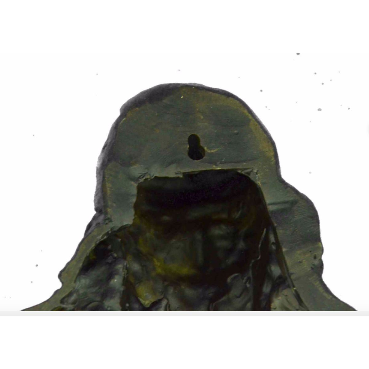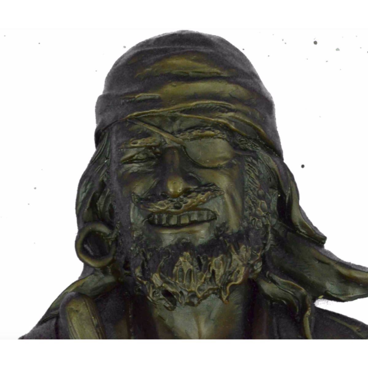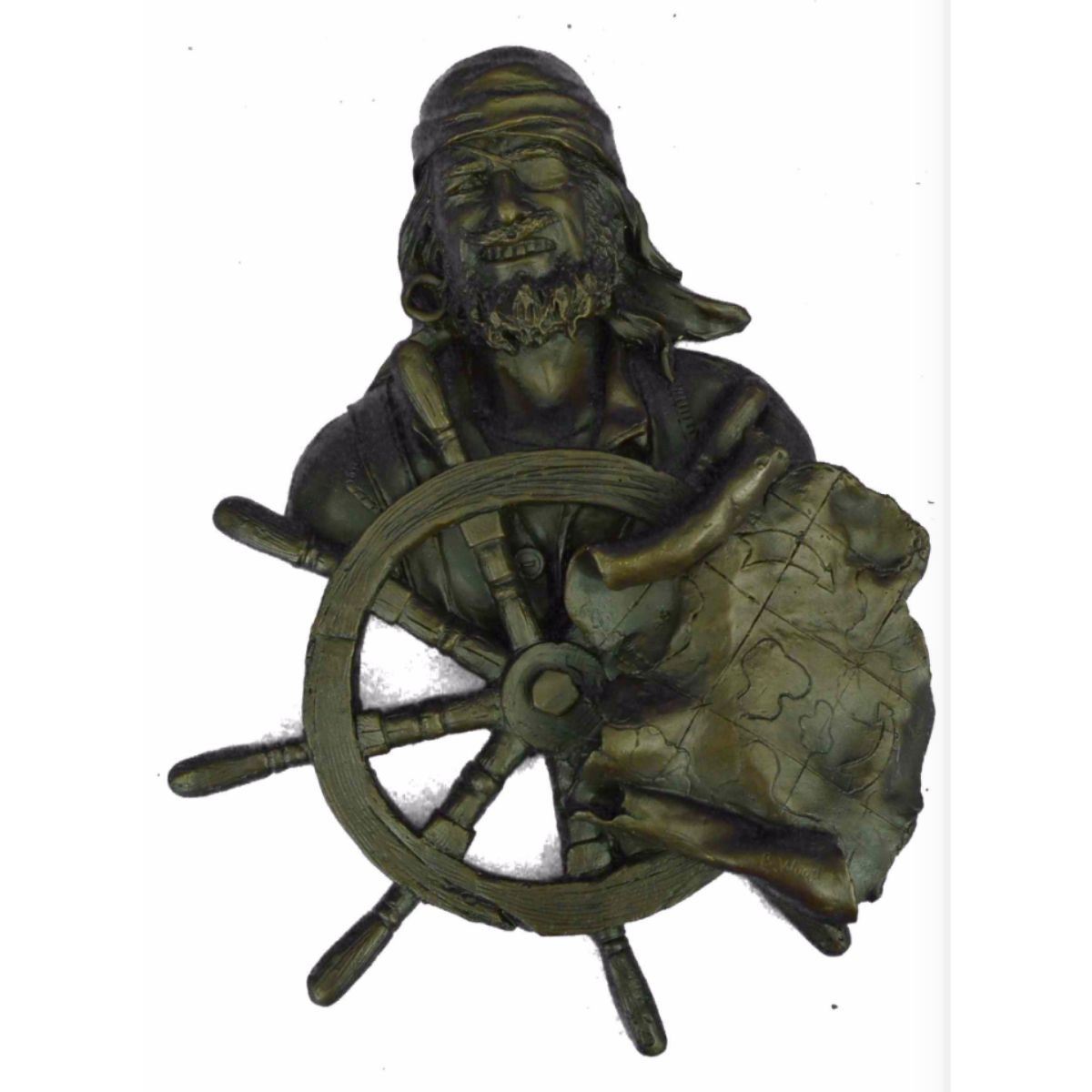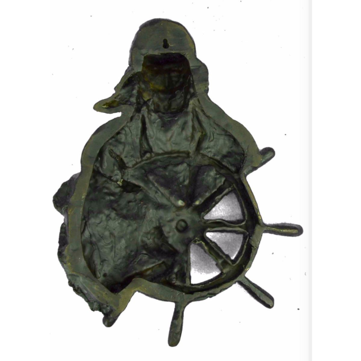 Signed original bronze sculpture, wall hanging, depicting a pirate captain, sea captain with ship's wheel. Pub bar, nautical, restaurant decor. Lost wax casting bronze sculpture, with brown patina. Mounting hook on reverse side.Â