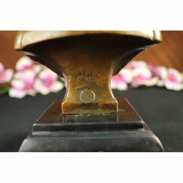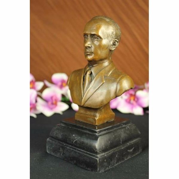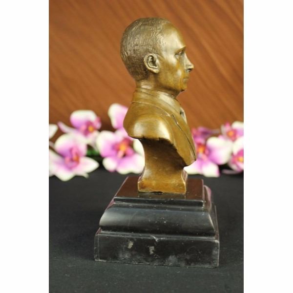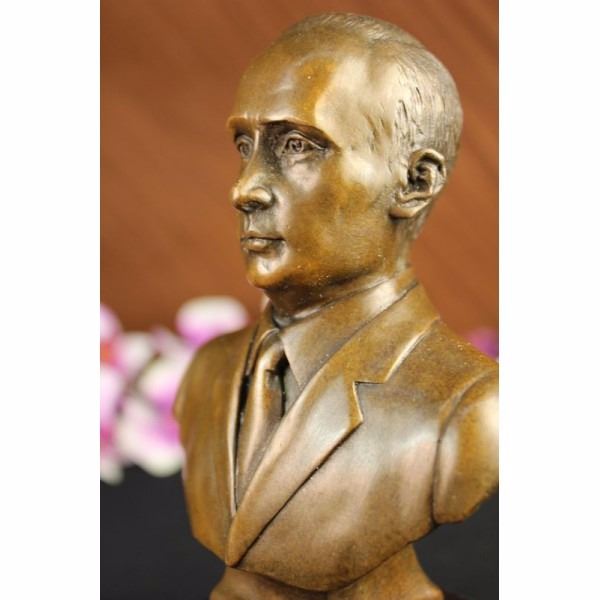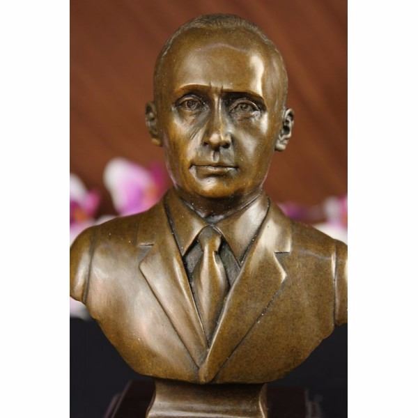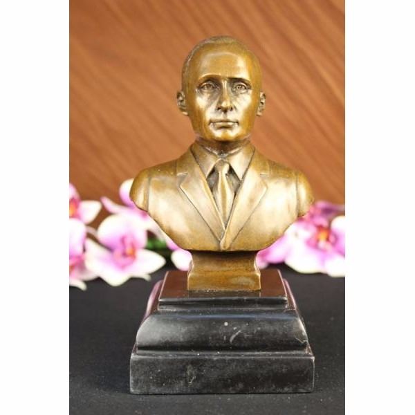 Vladimir Vladimirovich Putin was born October 7,1952 served as the second President of the Russian Federation and is the current Prime Minister of Russia, as well as chairman of United Russia and Chairman of the Council of Ministers of the Union of Russia and Belarus. He became acring President on 31 December 1999, when president Boris Yeltsin resigned in a surprising move. Putin won the 2000 presidential election and in 2004 he was re-elected for a second term lasting until May 7, 2008. Because of constitutionally mandated term limits, Putin was ineligible to run for a third consecutive presidential term. After the victory of his successor, Dmitry Medvedev. in the 2008 presidential elections. Putin was nominated by Medvedev to be Russia's Prime Minister. Putin took the post on May 8, 2008. Putin is credited with bringing political stability and re-establishing the rule of law. During his presidency, Russia's economy bounced back from crisis, seeing GDP increase by 72% in PPP (sixfold in nominal), poverty decrease by more than 50%, and average monthly salaries increase from $80 to $640. These achievements were ascribed to strong macroeconomic management, important fiscal policy reforms and a confluence of high oil prices, surging capital inflows and access to low-cost external financing, and were described as impressive by analysts. This Beautiful Vladimir Vladimirovich Putin. Condition : This sculpture is in perfect condition. Bronze Dimensions with Marble Base:Height 8" x Width 4" Marble Dimensions: 4" X 4" Height without base: 6 1/2" Weight :5 LBS Inventory : 69DS2302096