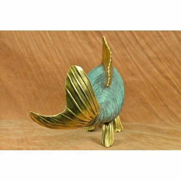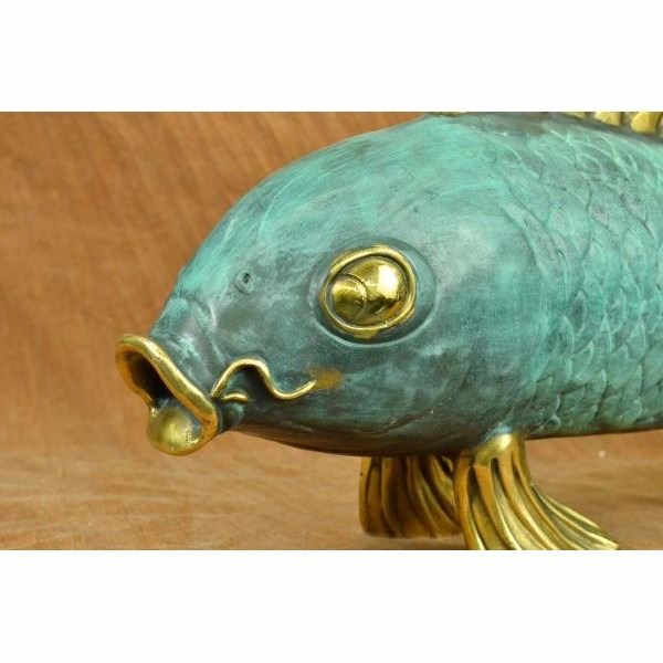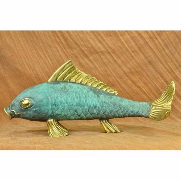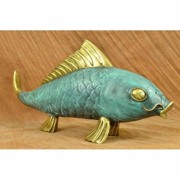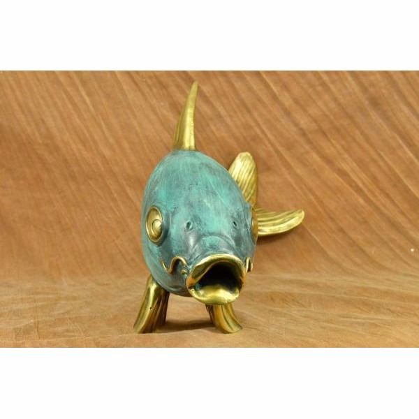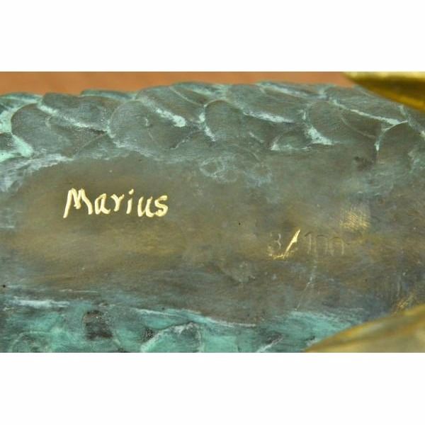 Authentic bronze sea life sculpture of a colorful, realistic Sea Bass sports fish leaping sideways out of a simulated ocean wave and is signed by artistMarius.This elaborate hand crafted sculpture art will make a spectacular addition to your fishing theme or as a gift to any avid bass collectors. Condition: This sculpture is in perfect condition. Bronze Dimensions :Height 11" x Width 24" Weight : 18 LBS Inventory : 53YDW002B11835
