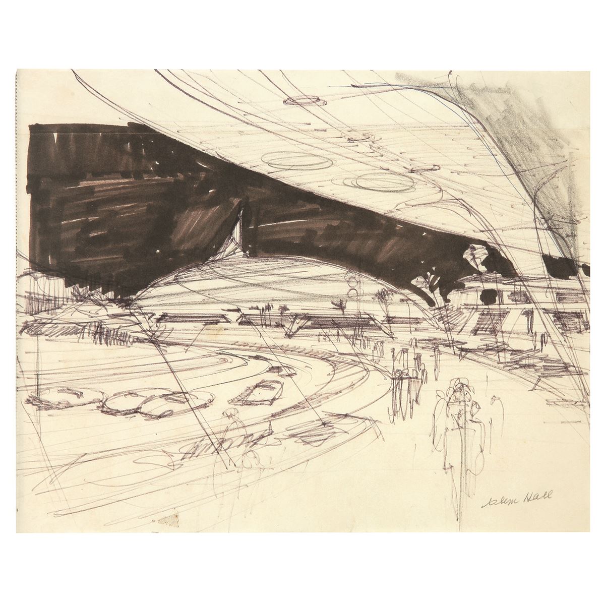 (Walt Disney World, 1974) Extremely rare original concept drawing of Space Mountain by Imagineer Clem Hall. The drawing features a stylized Space Mountain with the Autopia Attraction in the foreground. Accomplished in ink and graphite on 10.25”x8.5” sketch paper. Signed by Hall at the lower right with “Space Mt. Idea” written on reverse. In very good condition with minor wear.