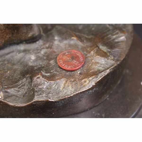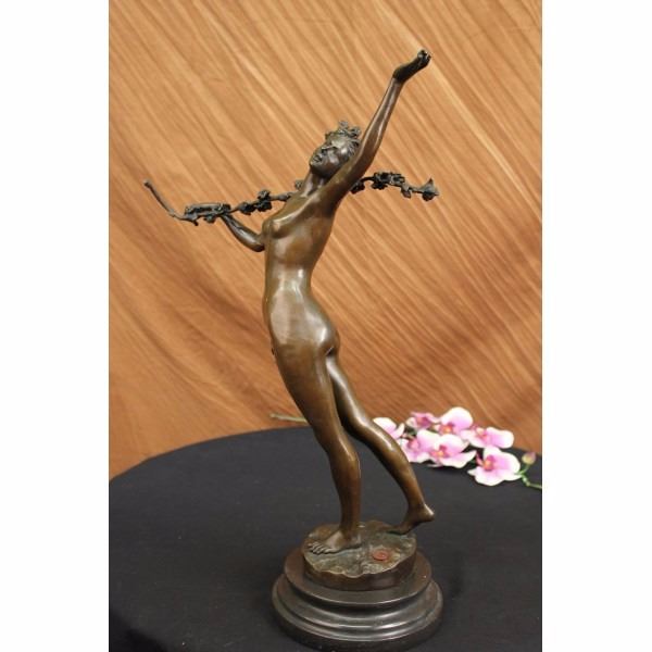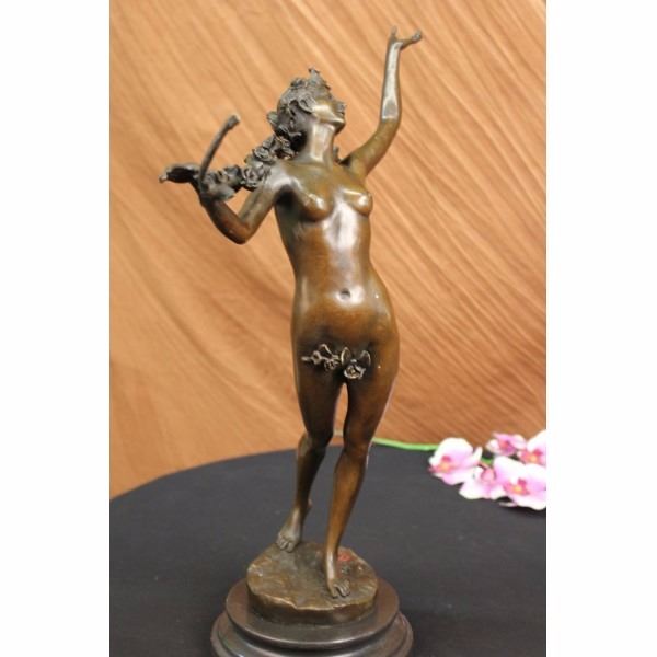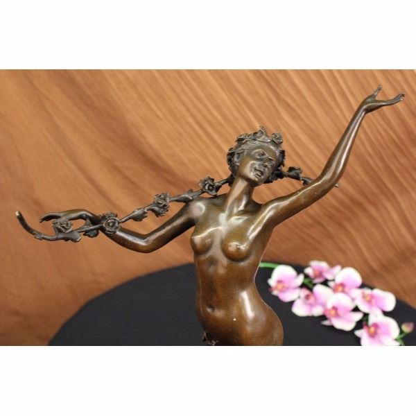 Calling out into the forest the wood nymph raises her arm and looks out onto the land. The flowers that cover her pelvis are the only covering her body has. Her feminine and curves remain nude. Blossomed flowers are present throughout this piece. She carries a long stem filled with many roses on her shoulder. This is a sensual and natural sculpture made of 100% bronze. It stands on a black marble base. The signature on this piece is Aldo Vitaleh. Condition: This sculpture is in perfect condition. Bronze Dimensions with Marble Base:Height 21" x Width 14" Marble Dimensions: Diameter 6" . Height without base: 20" Weight : 15 LBS Inventory 97Y8296579