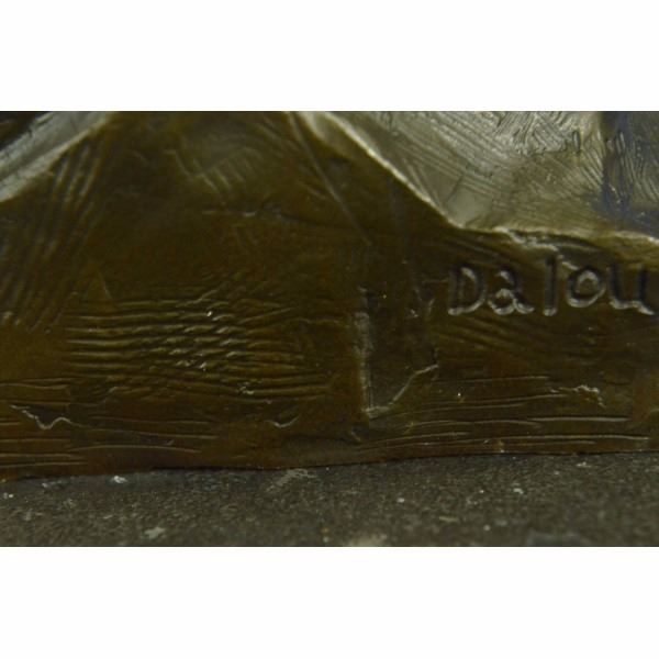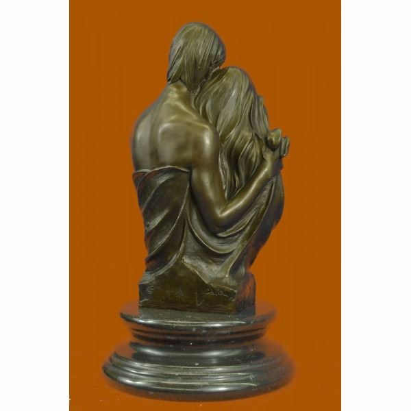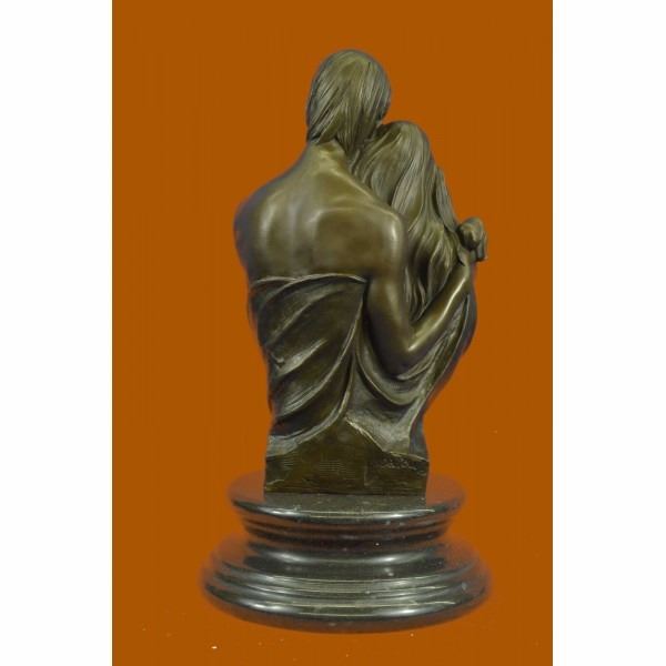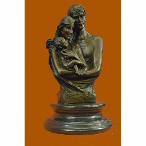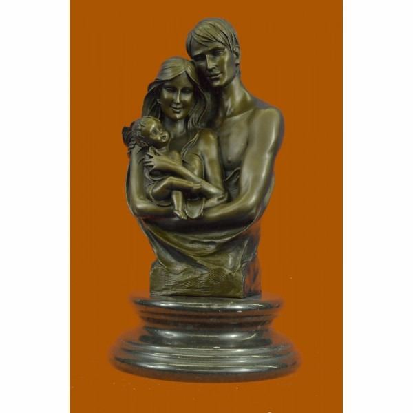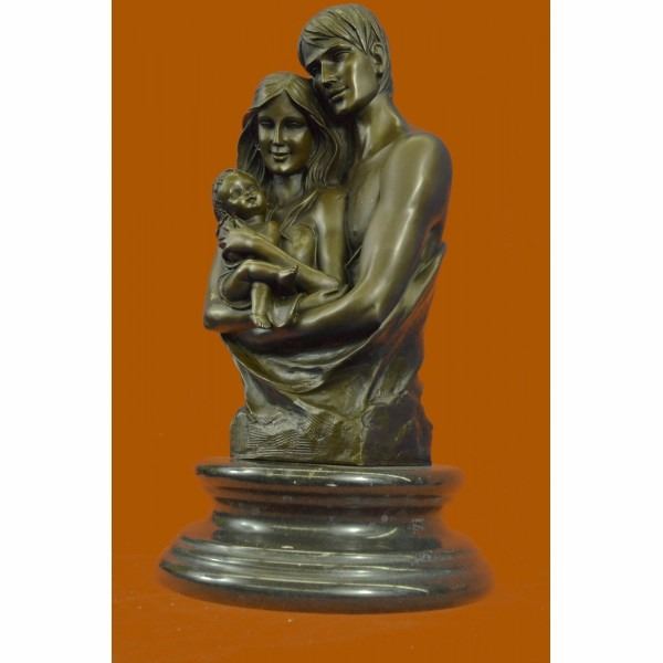 This bronze sculpture honors the union of marriage between man and woman celebrating their love for a lifetime. Within their embrace, with a smiling newborn child, a creation out of their old love. The adoring male figure seems to rest his face on the head of his wife thanking her for the gift she cradles. The new family was created using the age-old method of lost-wax casting and stained with a brown patina finish for preservation. They are mounted upon a black marble base with the artist Dalou's signature. Condition: This sculpture is in perfect condition. Bronze Dimensions with Marble Base:Height 16.5" x Width 9" Marble Dimensions: Diameter 9" Height without base: 13.5" Weight : 25 LBS Inventory : 30YDZ04910303