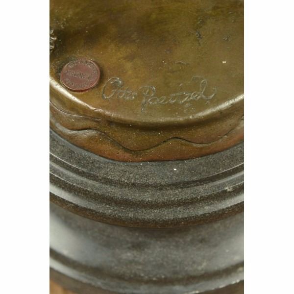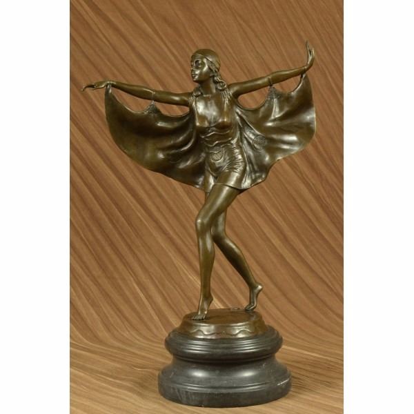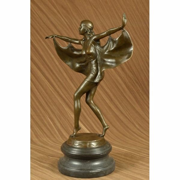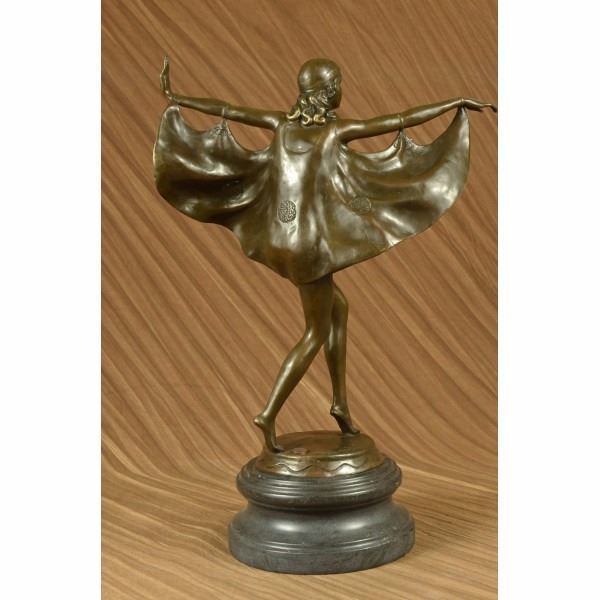 Modeled as a young woman standing on high arched feet, wearing a bat wing dress and with arms outstretched and is titled Bat Dancer. The handmade bronze sculpture was cast using the age-old method of lost-wax casting and stained with a brown patina finish for perpetuation. He is mounted upon a black circular marble base with the European Bronze Finery stamp of quality and the artist Otto Poertzel signature. Condition : This sculpture is in perfect condition. Bronze Dimensions with Marble Base:Height 18" x Width 12" Marble Dimensions: Diameter 7" Height without base: 15" Weight : 19 LBS Inventory : 43EP4589434