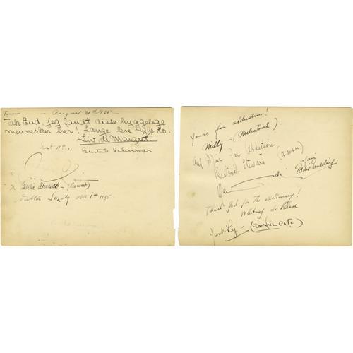 <B>Signed Pages from Clifton Webb's Guest Book, Including Marlene Dietrich.</B></I> Love all, Marlene! A tennis match was the site for at last some of these signatures, gathered on two pages amidst three different dates - August 31, September 17 and October 1, 1935. The signers are no less than Ina Claire (a great stage star, then divorced from John Gilbert), Lewis Milestone (Academy Award-winning director of <I>All Quiet on the Western Front</B></I>), Edmund Goulding (director of the all-star classic <I>Grand Hotel</B></I>), and - last but certainly never least - Marlene Dietrich (who that year starred in <I>The Devil is a Woman</B></I>). Sharp clean autographs from their signers at their prime! Excellent condition. <I>Accompanied by LOA from PSA/DNA.</B></I><BR><BR><b>Shipping:</b> Flat Material, Small (<a target="_blank" href="http://www.heritageauctions.com/common/shipping.php">view shipping information</a>)