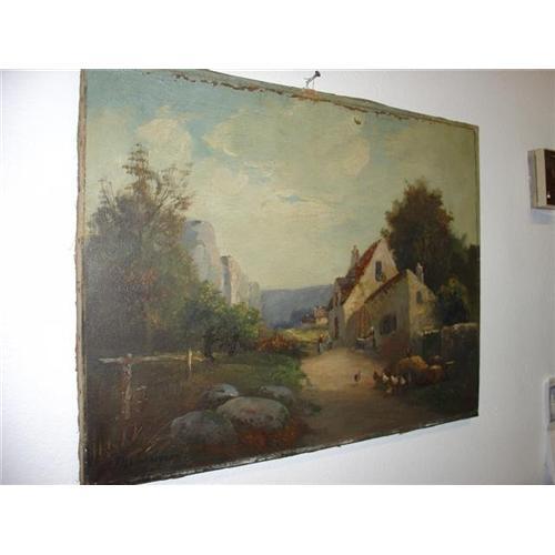 This is a beautiful farm scene paiting, depicting Normandy, France. The oil on canvas painting is well over 100 years old, and is fair condition. It is signed "Linsyer". We have two frames for sale that will fit this painting. Please contact us for more info!