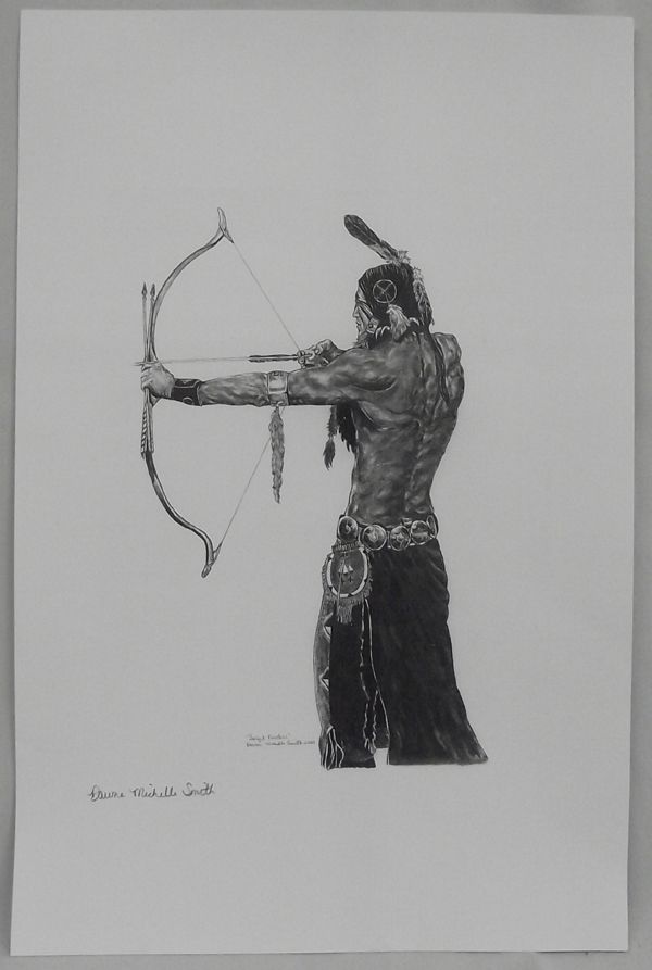 From the Collection of Nick & Suzanne Nicholas.Signed Pen & Ink Print by Dawne Michelle Smith. This beautiful piece titled ''Target Practice'' Shows a Native American Shooting his recurve bow. Extremely well done.