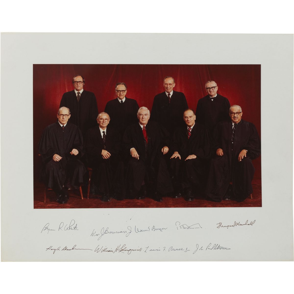 Supreme Court photo display signed by all nine Justices of the Burger court, circa late 1970's. Signed by Warren Burger, William Rehnquist, Thurgood Marshall, Potter Stewart, Harry Blackmun, Lewis F. Powell Jr., Byron White, William J. Brennan, Jr. and John Paul Stevens. The 14'' x 9'' matte-finish photo is matted to a size of 18'' x 14'', upon which the Justices sign. A few faint ink marks are present, not affecting signatures, else fine. A rare signed photo by one of the most controversial courts of the 20th century.