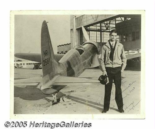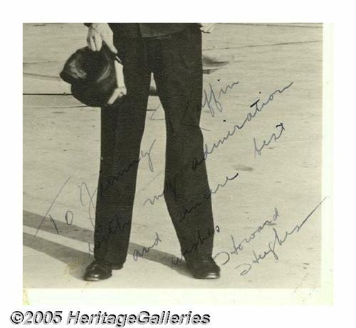 <B>Signed Photo of Howard Hughes Standing by His Plane</B></I> The first modern and practical respirator was called the "iron lung," invented by Harvard University researcher Philip Drinker in 1927. He used an iron box and two vacuum cleaners to exert a push-pull motion on the chest. There were many young polio victims in the 1930s suffering from chest paralysis that had to be placed in this restrictive and immobilizing device just to be able to breathe. The story goes that there was one such child, Jimmy Ruffin, whose mother would write letters to famous personalities in order for him to receive "get well" messages, autographs and signed photos, boosting his spirits. This fabulous 10" x 8" black and white photo pictures a young Howard Hughes standing by a small plane. The famous aviator has written, <I>"To Jimmy Ruffin with my admiration and sincere best wishes. Howard Hughes."</B></I> Fine condition, framed. Rare and desirable. <I>Accompanied by COA from PSA/DNA.</B></I> Lot:254