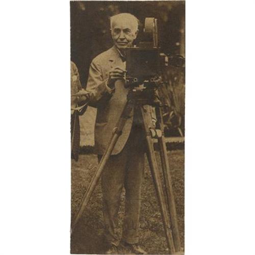 <B>Photograph of Thomas Edison Signed</B></I> "<I>Thomas A. Edison</B></I>". 2.5" x 5.25", signed on a portion of photograph excised from a larger sepia news photograph, small portion of Edison's "umbrella" over the signature clipped at the extreme left side, else good. The contrast between the sepia photo and the ink render the signature difficult to read.<BR><BR><b>Shipping:</b> Flat Material, Small (<a target="_blank" href="http://www.heritageauctions.com/common/shipping.php">view shipping information</a>)