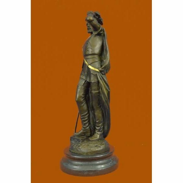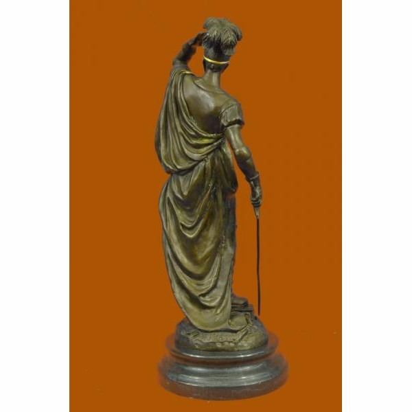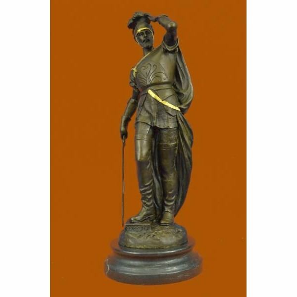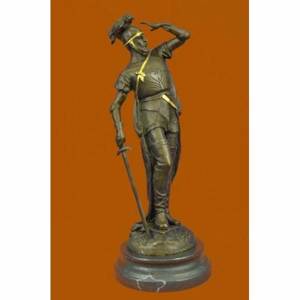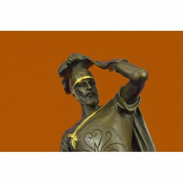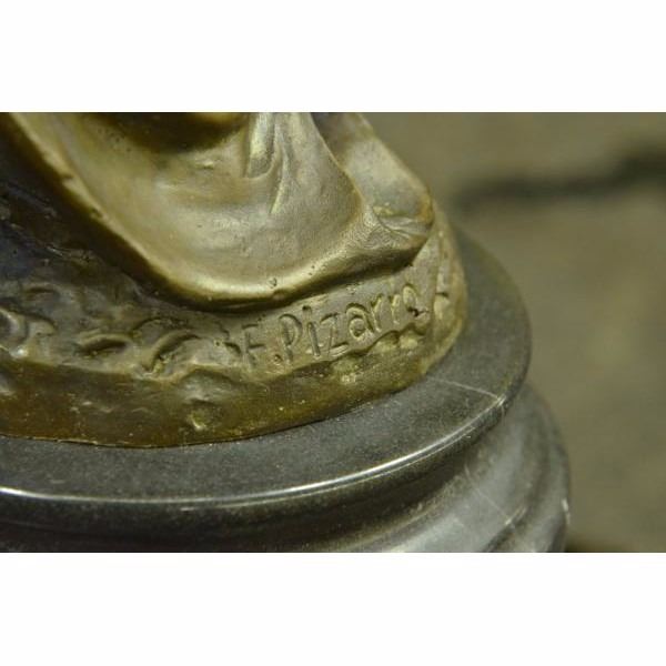 The Roman legion soldier stands looking to the horizon of a scarred battlefield. He is wearing some of the soldier's regalia. Atop of his head he wears a galea, which is a soldier's hat. Down his back falls a paludamentum, which is a long cloak fastened over one shoulder, usually signifying the commander's status. Around his waist he wears a tunic which is customary for soldiers to have it a little above the knee. In his right hand he carries a sword used in offense. The bronze handmade sculpture was cast using the ancient method of lost-wax casting and stained with a brown nd gold patina finish for preservation. It is mounted upon a black variegated marble base with the artistF.Pizarro signature. Condition: This sculpture is in perfect condition. Bronze Dimensions with Marble Base:Height 15" X Width 7" Marble Dimensions: Diameter 6" Height without base: 14" Weight : 11 LBS Inventory : 89STE3527BG5995