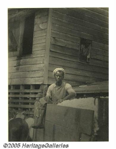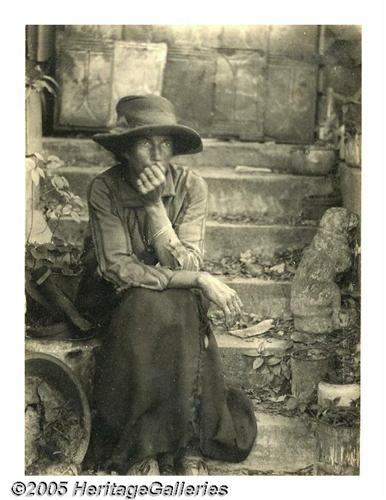 <B>Signed Platinum Print Photograph by Doris Ulmann</B></I> Ulmann was born in New York City in 1882 and became a popular photographer taking portraits of the "rich and famous." Between the years of 1927 and 1934 she traveled the south taking thousands of pictures of the people in the Appalachian Mountain area, and their crafts and homes. She felt that their culture was in danger of dying out and her photos comprise likely the finest record of this area. She once said, <I>"I now feel that one ought to be able to do something that is a lasting thing for the world... something that will always have real value."</B></I> Her photographs certainly accomplished that. Ulmann worked with a bulky, old-fashioned view camera on a wooden tripod taking 6.5" x 8.5" negative plates from which she made contact prints on platinum paper, always in small quantities. This lot contains one of her prints, signed in pencil on the mount. It is of a black woman sitting on some steps. She is wearing a wide-brimmed hat, a striped shirt and a long skirt. The far-away look in her eyes makes this a beautiful and moving photograph. An original print of 6" x 8", circa 1930. Ulmann's work was largely forgotten for many years but since the 1970s, its historic importance has been fully realized. Lot:250