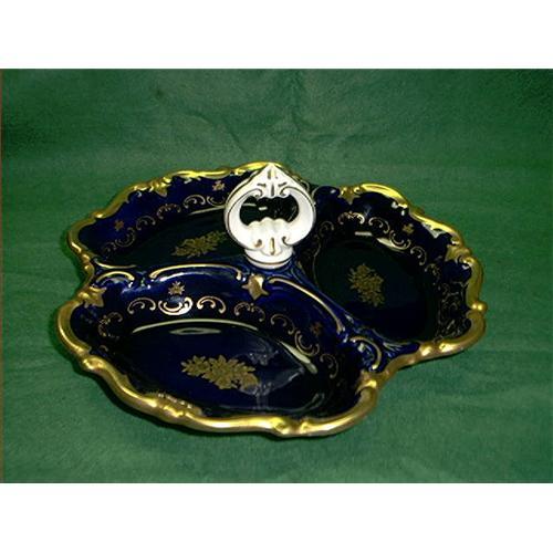 Signed Porcelain Cobalt Blue Dish. Hand painted with decals. Gold trim painted with scrolls and other designs. In excellent condition. Signed and Hall marked. Has two different signatures, plus hall marked with a blue R and crown. States "Fine China Etcht Kobalt Made in German Democratic Republic".