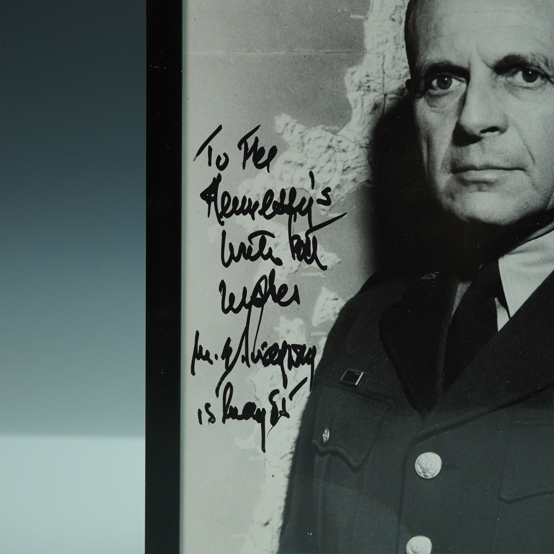 Black and white portrait photograph of General Matthew B. Ridgway, inscribed and signed in black ink. The dedication reads, To the Kennedy’s with best wishes, followed by Ridgway’s signature and military title. General Ridgway was a prominent U.S. Army officer who served as Supreme Allied Commander Europe and led the 82nd Airborne Division during World War II and the United Nations forces in the Korean War. The photograph captures him in full military dress with medals, set against a strategic map, and comes framed under glass. Frame measures 8.5"L x 10.5"H.