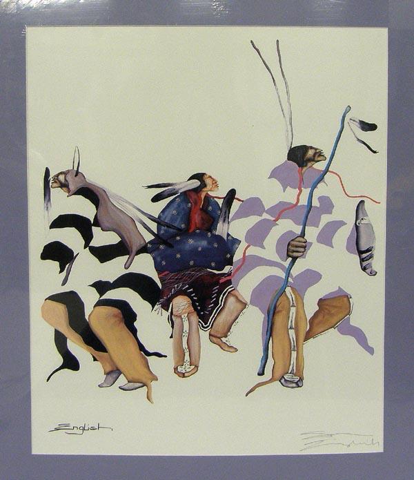 Signed Print of Pueblo Dancers by Sam English. Matted and Backed With Foam Board, Shrink Wrapped. Visual Measures 23.5''x19.5''. On the back "American Indian Center 20th Anniversary 1969-1989" Also small card stating that the name of the picture is "Him, Her & Him Dancin" Sam English. SHI $35.
