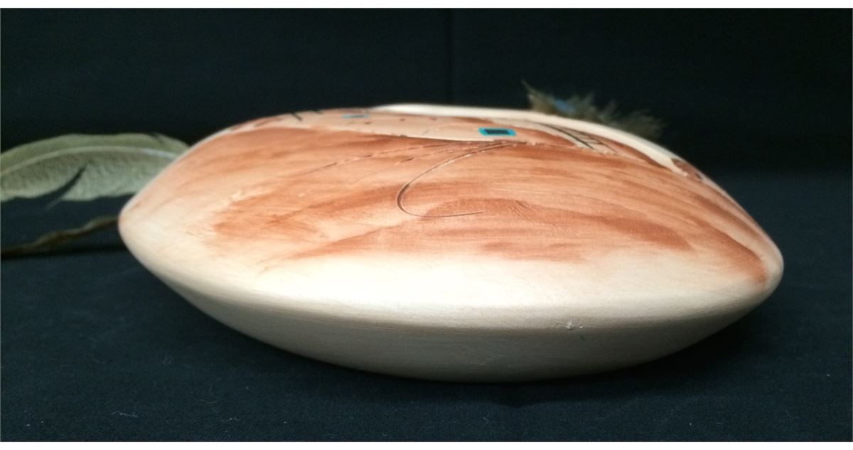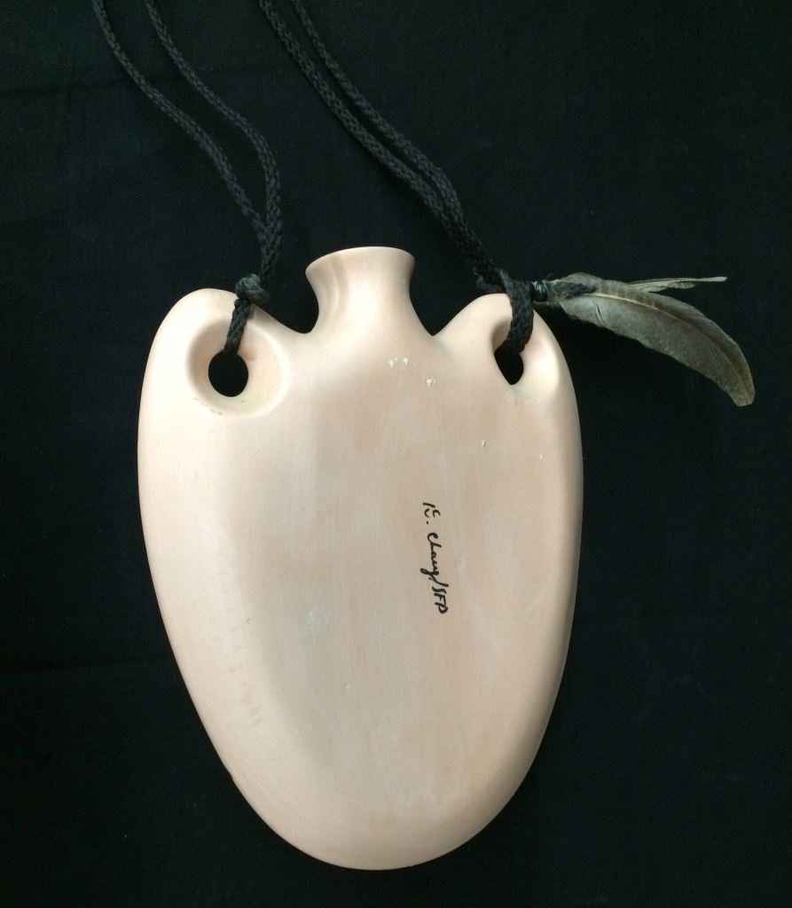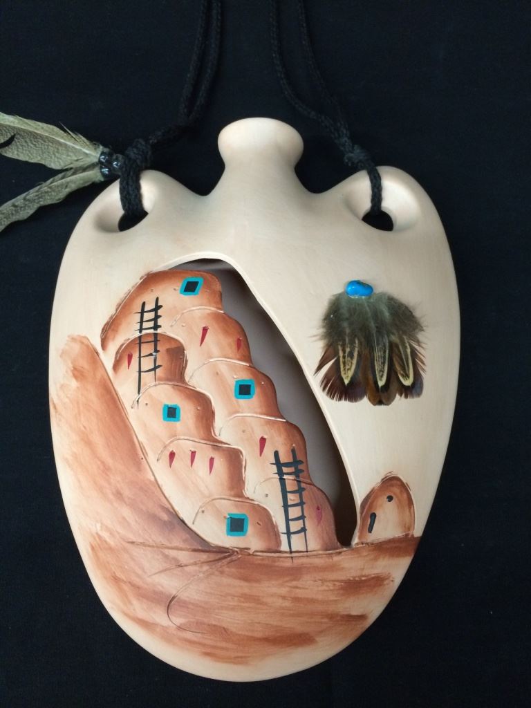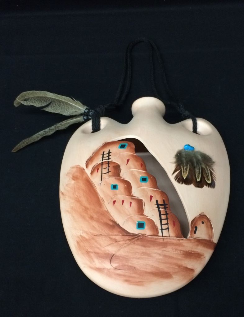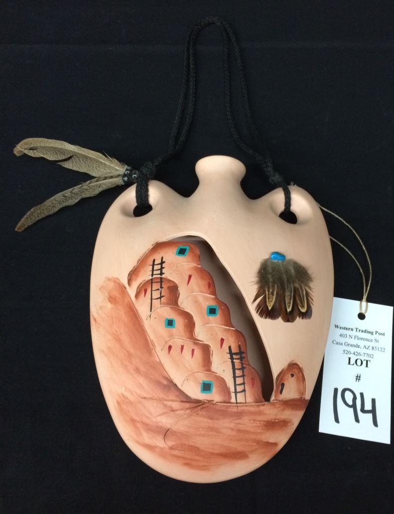 This handmade, hand-painted pot is signed with what looks like the initial “D.” and Chavez, San Felipe Pueblo. Made as a decorative wall hanging, it measures 10” long not counting rope hanger. Shipping: There will be a $7 handling / packaging fee for shipping this lot. The actual cost of postage will be added on top of that.