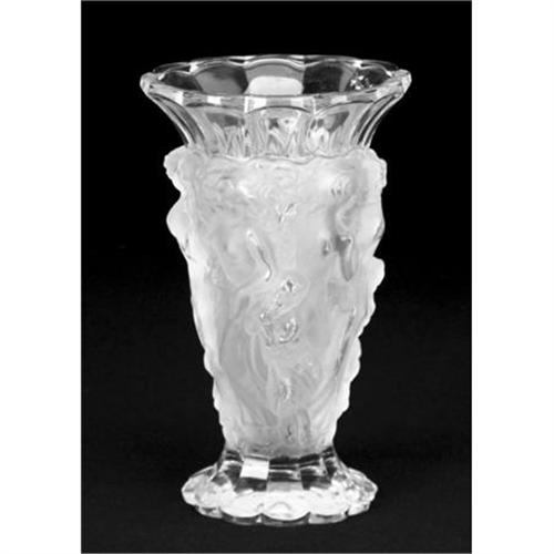 Signed R Lalique Vase. Blown-out mold of figures including man, woman and Pan. Signed on base with acid etched script signature - R. LALIQUE FRANCE 5222. It measures 8 ½? tall. The vase is in excellent condition! Circa early 1900's.