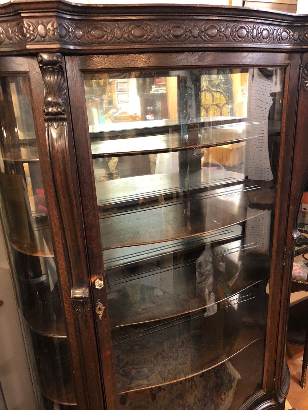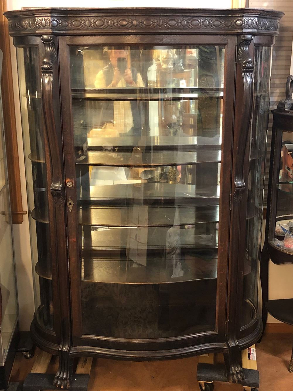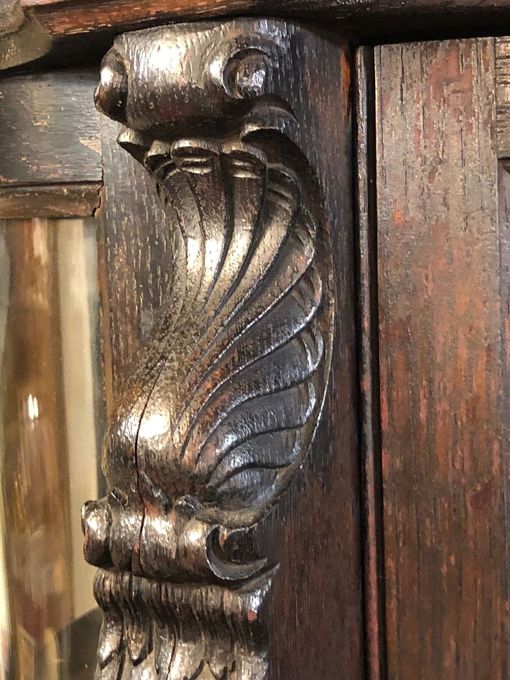 Monumental oak labeled RJ Horner Crystal cabinet with unusual serpentine S-Front, curved glass sides, claw feet, mirror back, 4 adjustable shelves with plate rails, carved dolphins on either side. Original paper label on back, all in tacked, R.J. Horner and Co., very rare to find one with paper label. Original finish, had always been in the same family for years until we were able to offer this for auction. Measures approx. 65” tall x 49” wide x 19” deep. A MUST for any collector of RJ Horner.