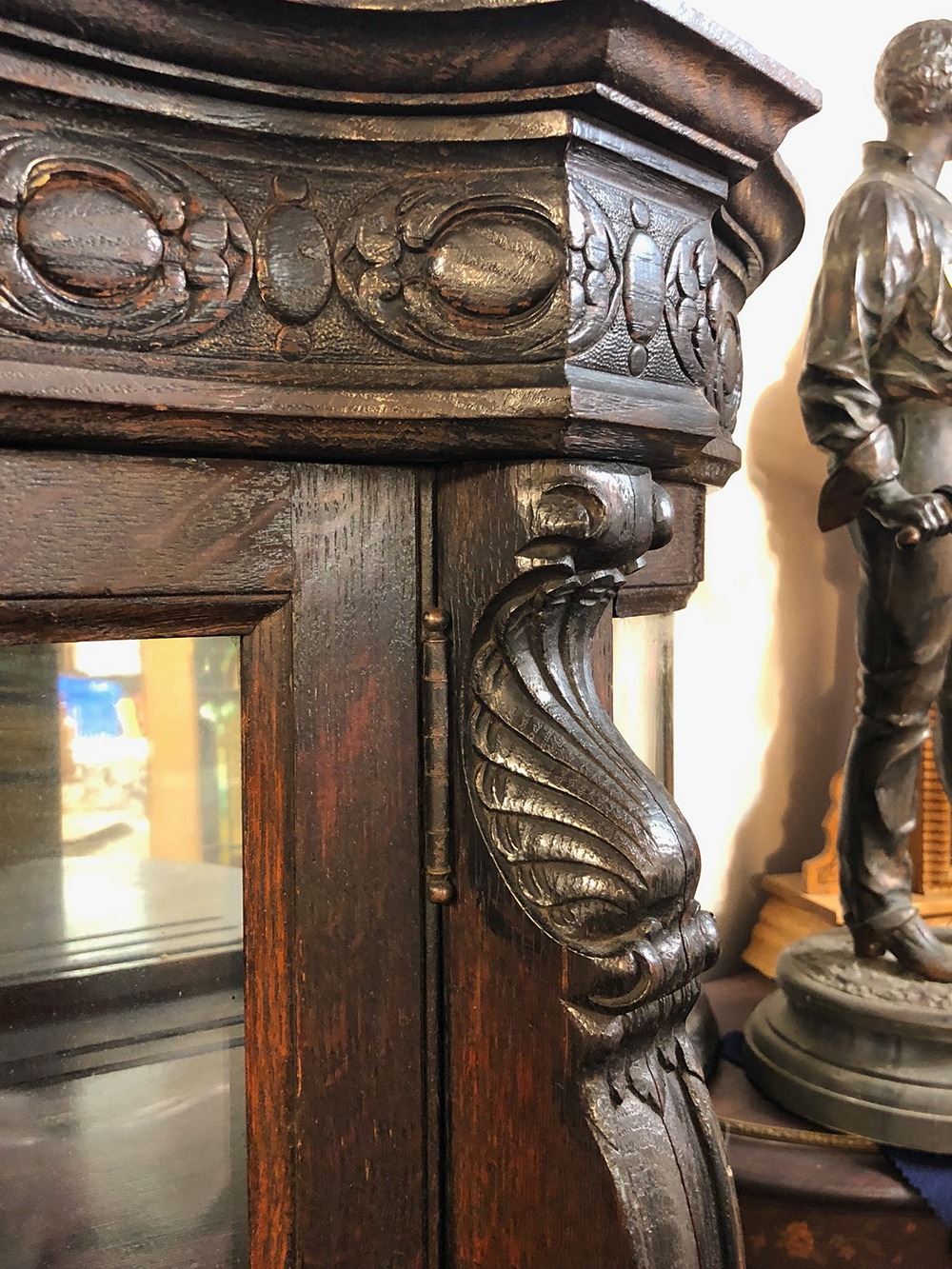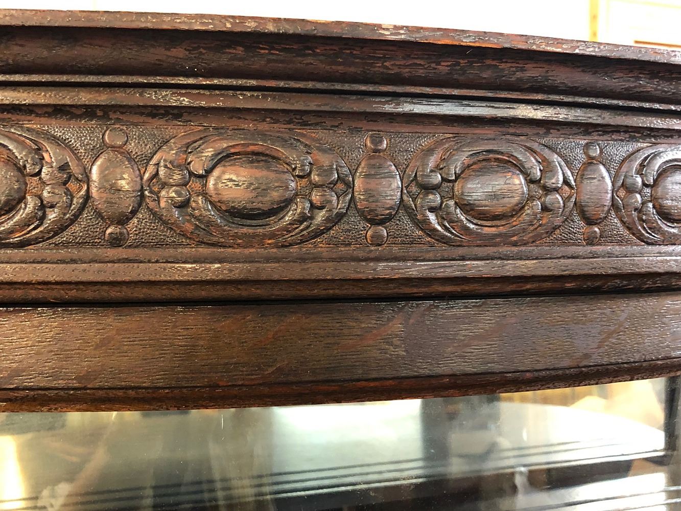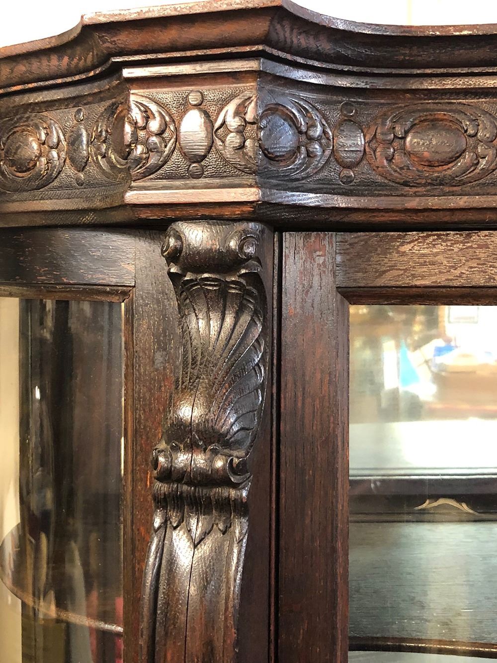 Monumental oak labeled RJ Horner Crystal cabinet with unusual serpentine S-Front, curved glass sides, claw feet, mirror back, 4 adjustable shelves with plate rails, carved dolphins on either side. Original paper label on back, all in tacked, R.J. Horner and Co., very rare to find one with paper label. Original finish, had always been in the same family for years until we were able to offer this for auction. Measures approx. 65” tall x 49” wide x 19” deep. A MUST for any collector of RJ Horner.
