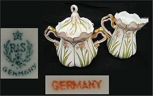 "Signed "RS Germany Covered Sugar" and a signed "Germany" creamer. Creamer has a chip to spout, covered sugar has a chip to rim. All hand painted in greens, gold and pink on a white porcelain base