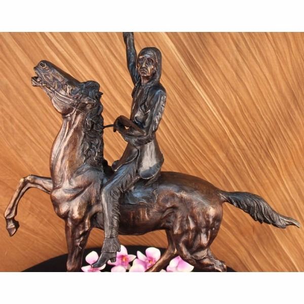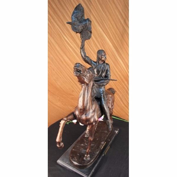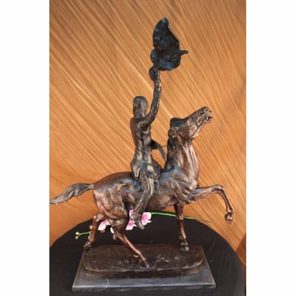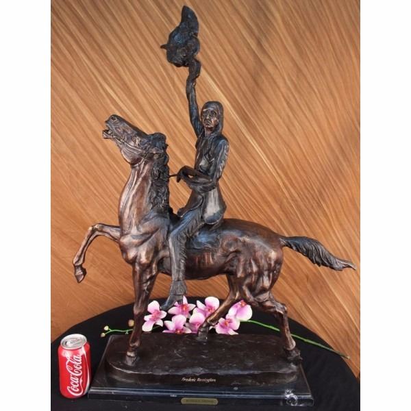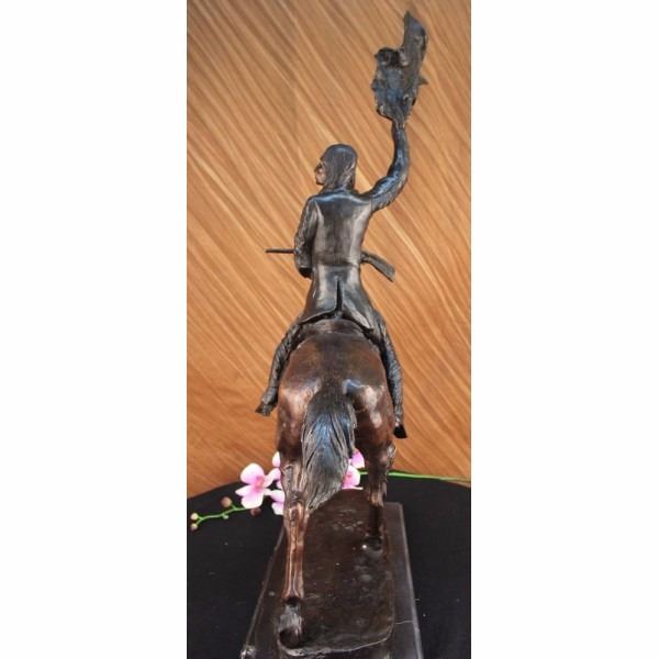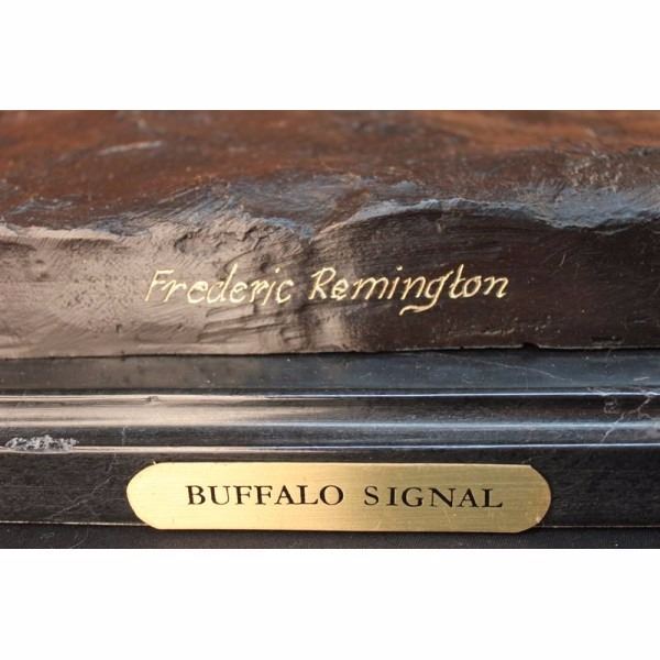 One of Frederic Remington's rare bronze sculptures, "The Buffalo Signal" captures a Native American warrior sits triumphantly atop his horse. He holds his head high with defiance and triumph set in his intense eyes. Above his head he holds the hide of a slain buffalo, signaling victory. His gun lay across his lap, as he comfortably sits on his trusted horse. The horse trots with the same pride, raising his hoofs high. 100% bronze and handmade, this two-toned brown patina sculpture was cast using the "Lost Wax Method" and mounted on a marble base. Condition : This sculpture is in perfect condition. Bronze Dimensions with Marble Base:Height 33" x Width 26" Marble Dimensions:19" X 8 1/2" Height without base: 32" Weight : 42 LBS Inventory 68-57060M15786