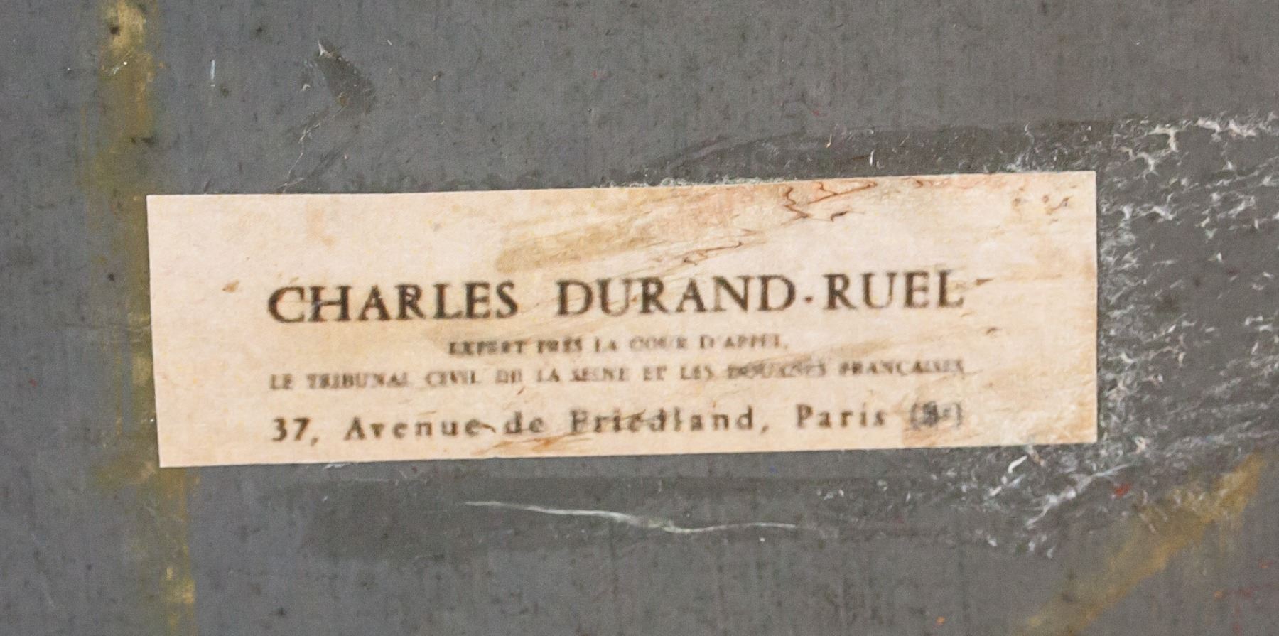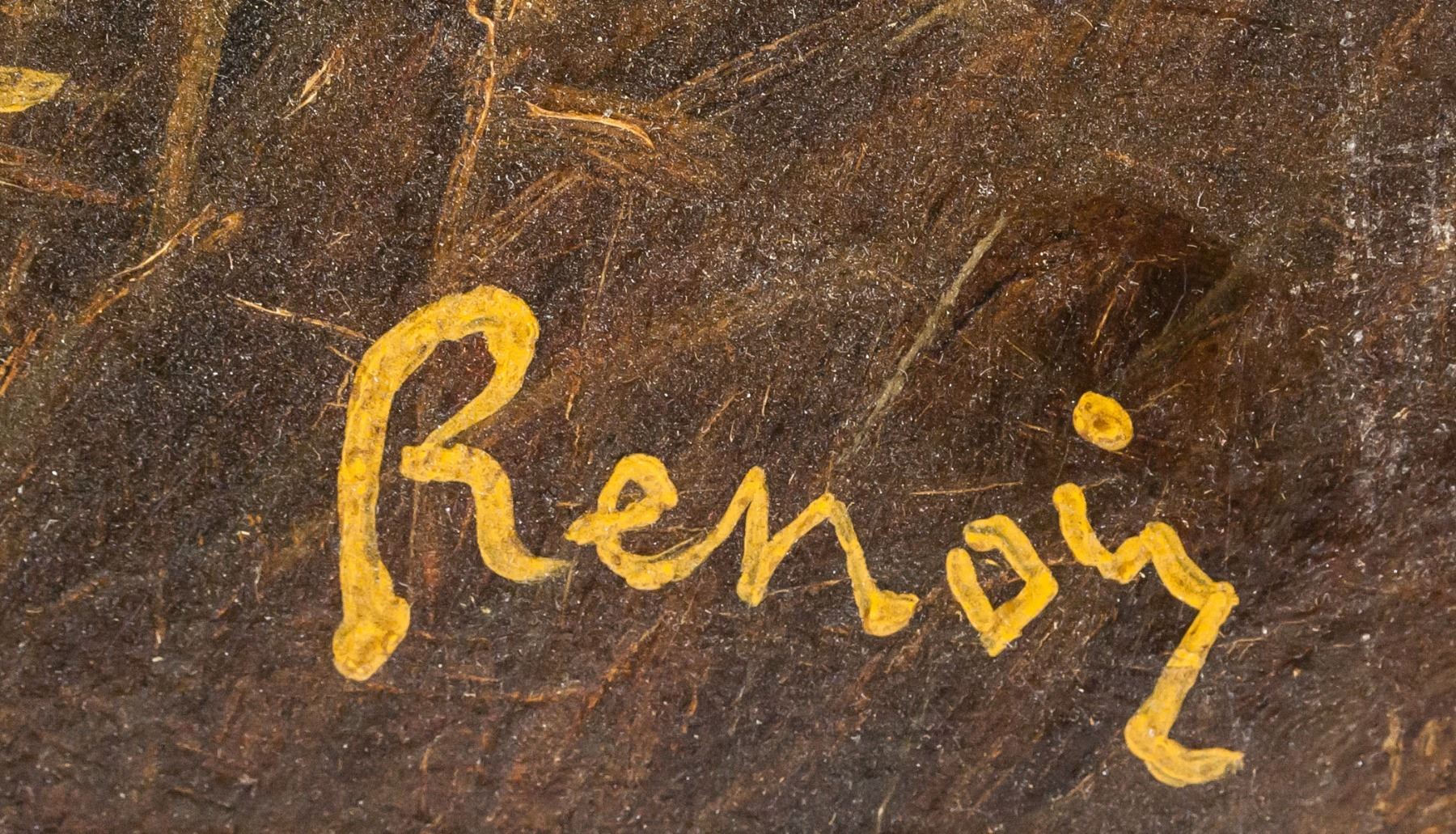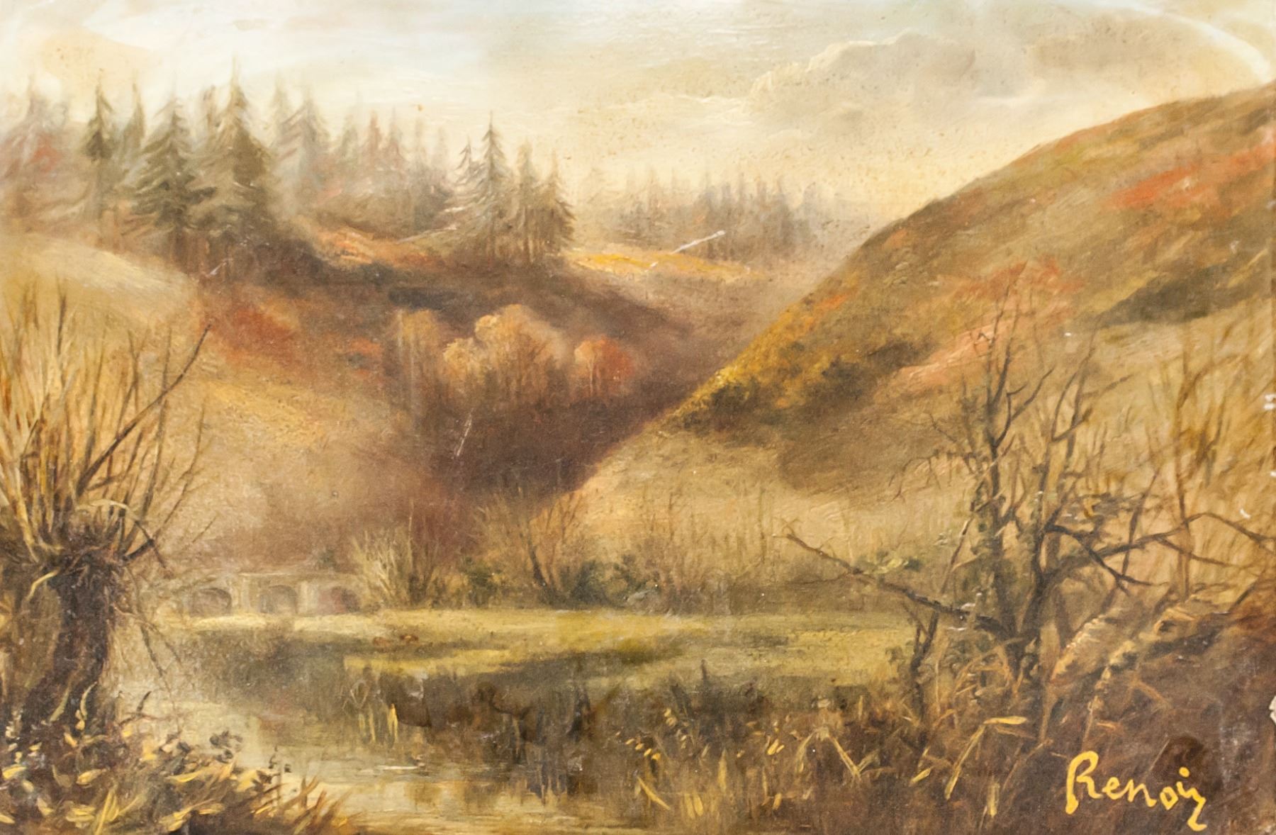 Oil on board. Featuring murky landscape scene of a pond surrounded by hills. Signed "Renoir" in the bottom right corner. Labels on verso reads "Pierre-Auguste Renoir 1841-1919" and "CHARLES DURAND-RUEL". "Galerie Mathias Fels PARIS" stamped on first label. 30 x 45 cm (11.5 x 17.75 inches).