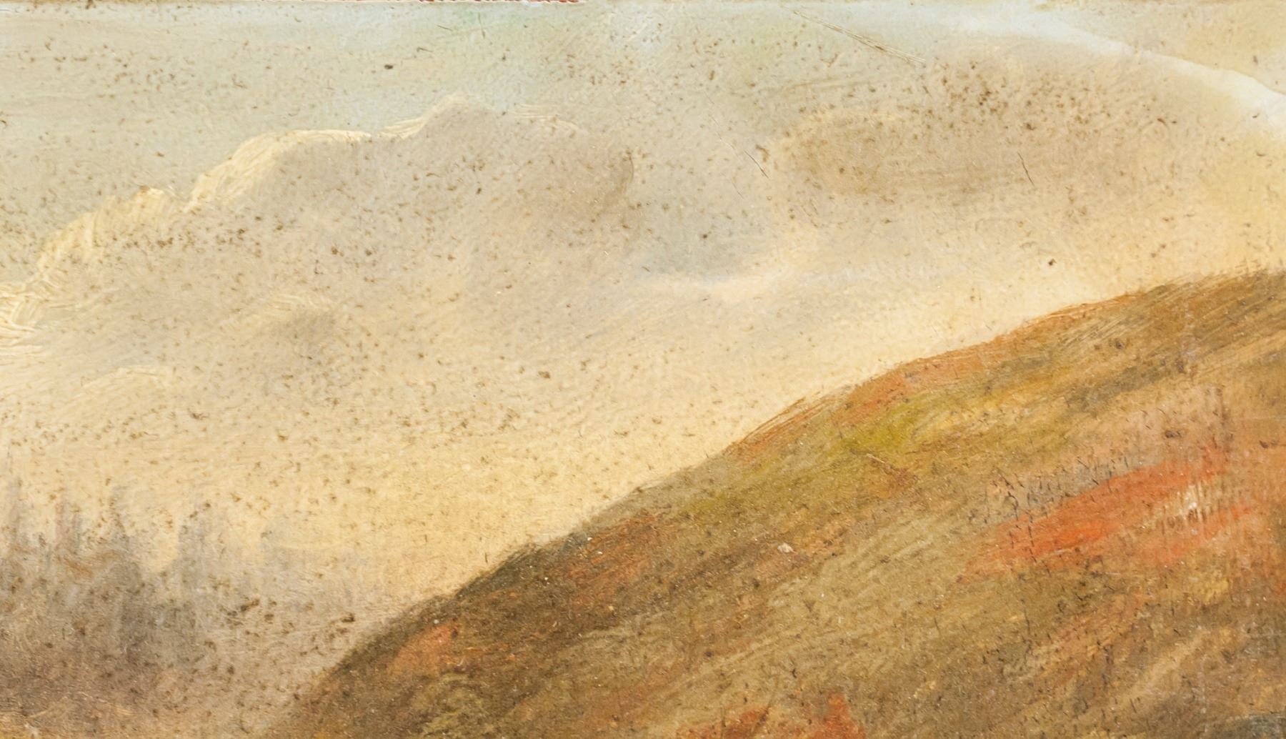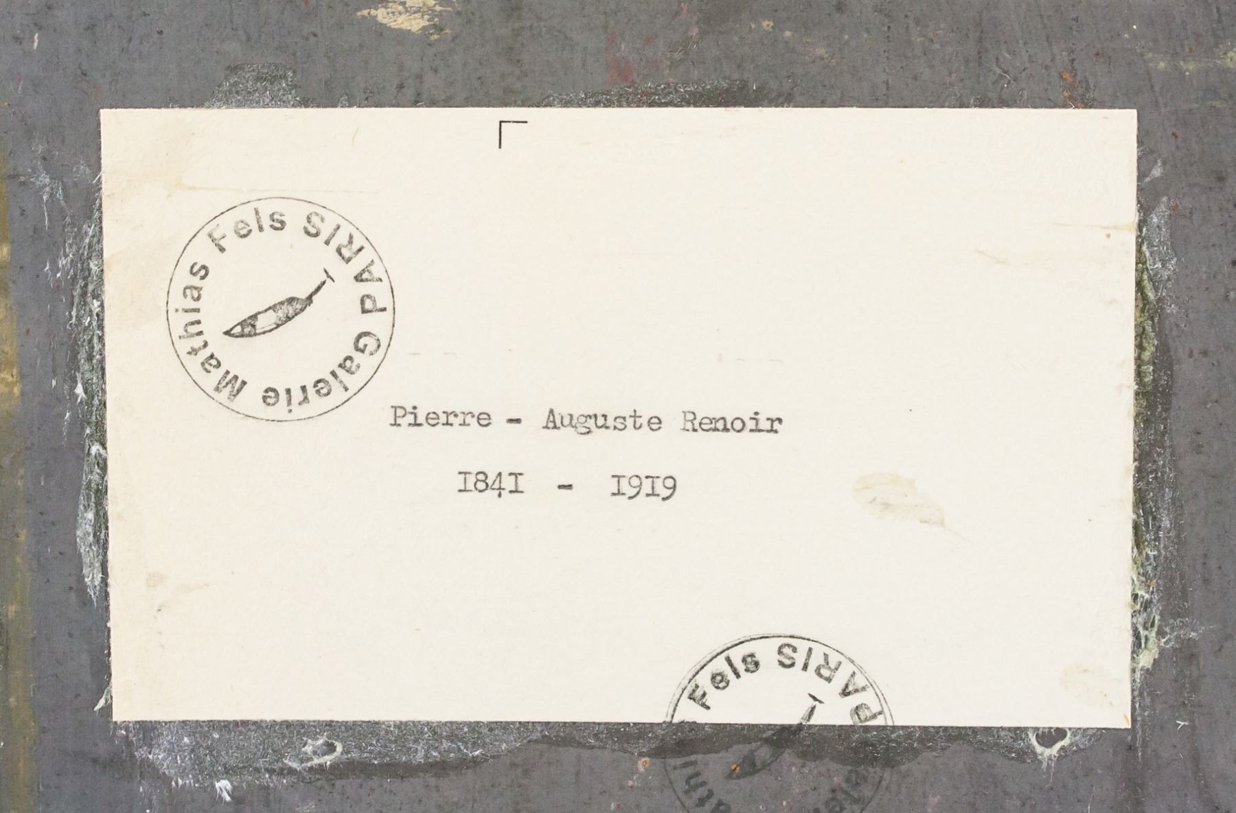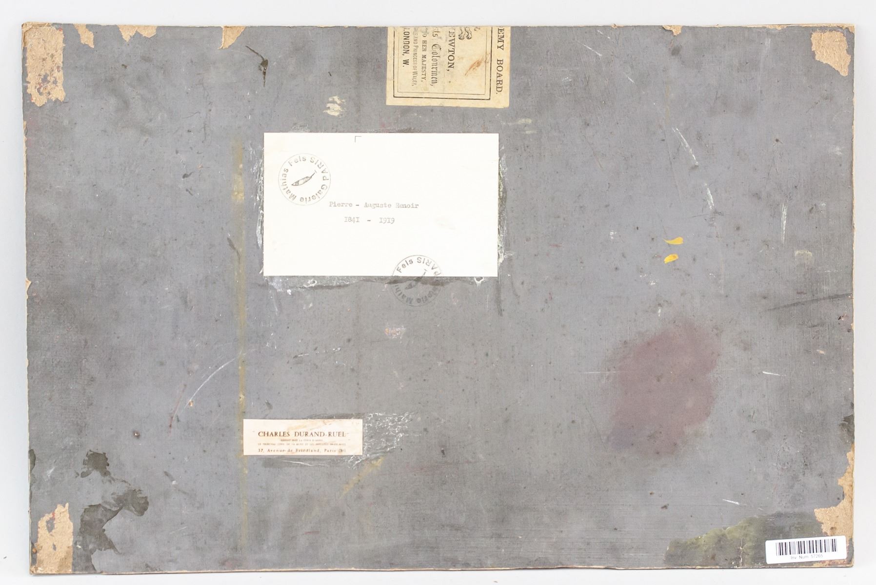 Oil on board. Featuring murky landscape scene of a pond surrounded by hills. Signed "Renoir" in the bottom right corner. Labels on verso reads "Pierre-Auguste Renoir 1841-1919" and "CHARLES DURAND-RUEL". "Galerie Mathias Fels PARIS" stamped on first label. 30 x 45 cm (11.5 x 17.75 inches).