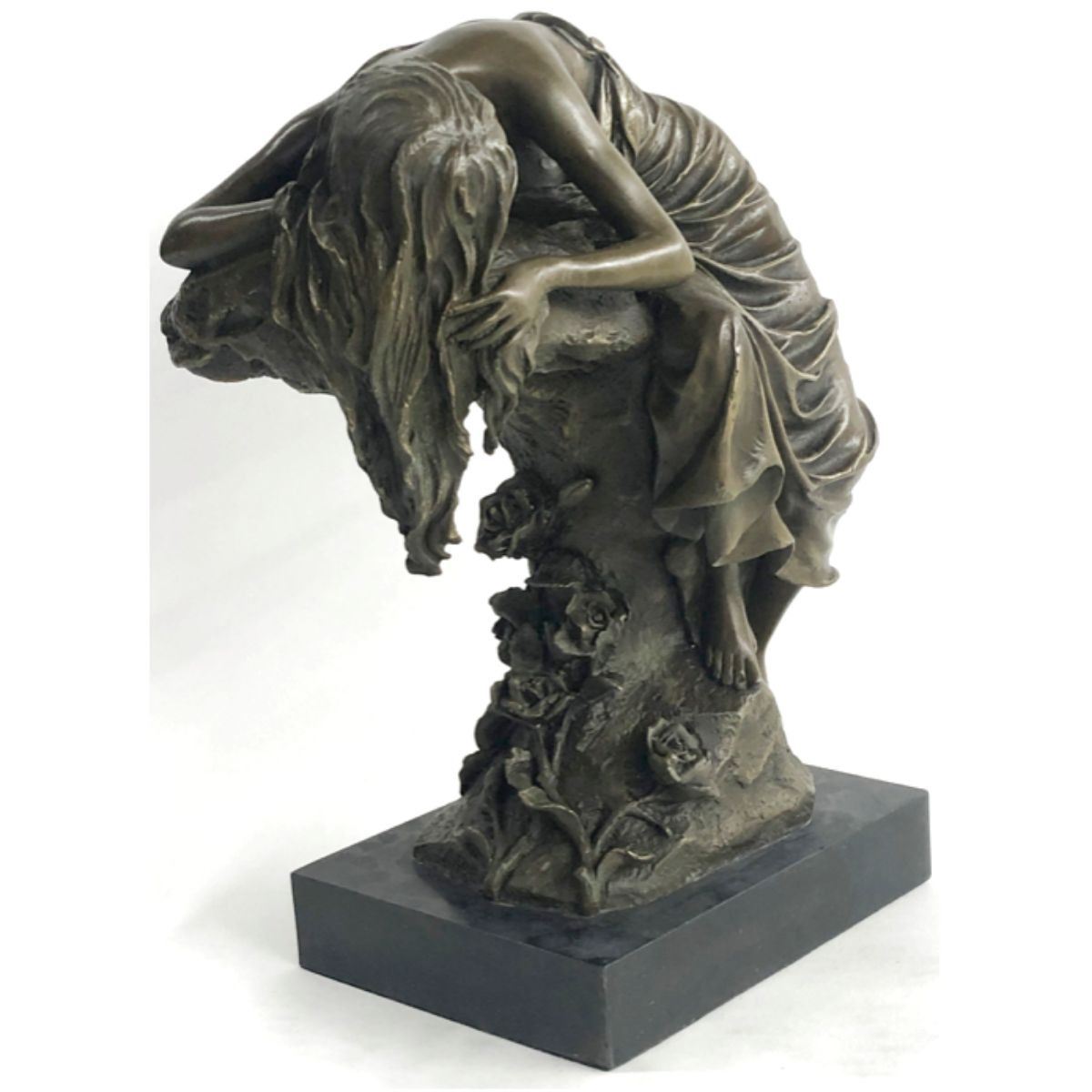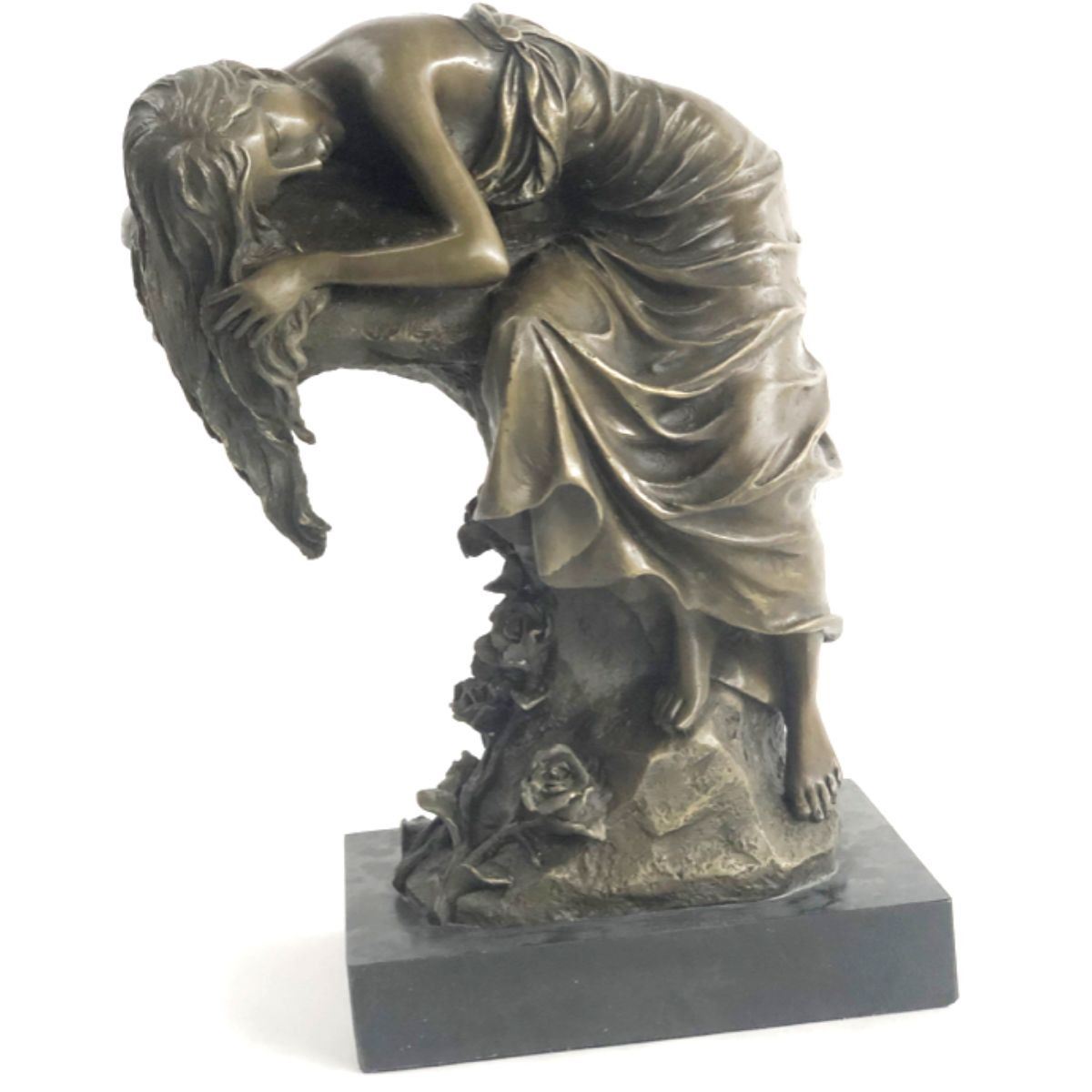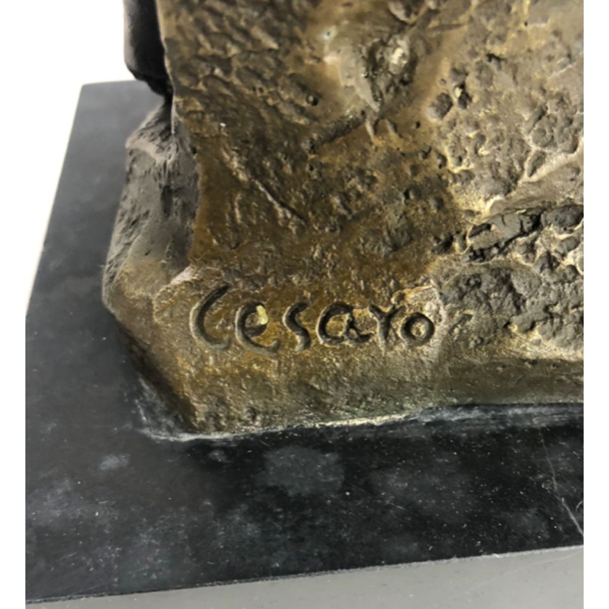 Signed original sculpture of a resting maiden. Lost wax casting method bronze, with brown patina, mounted on a marble base. Signed by the artist, Cesaro, at the base. 11" H X 9" W. 15lbs.