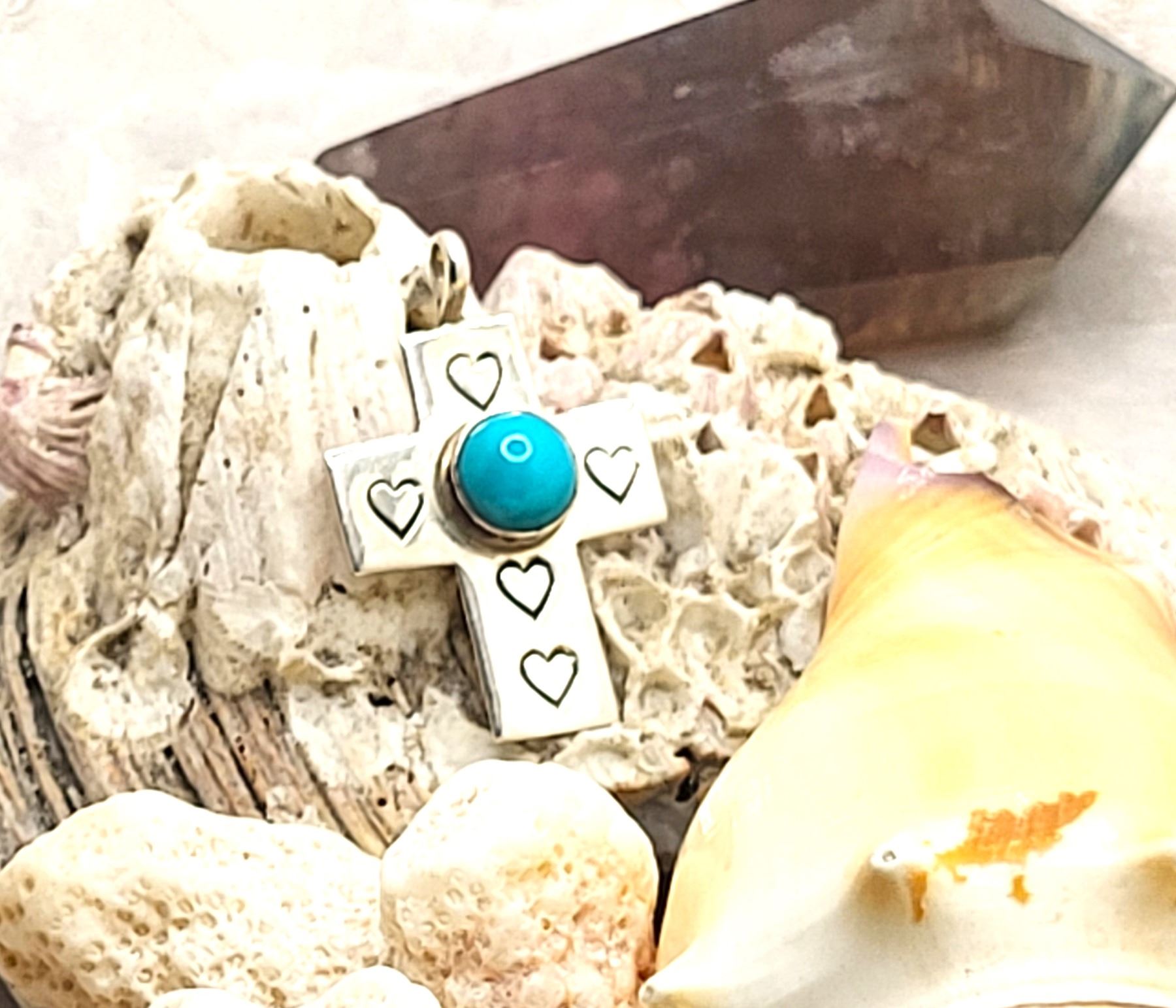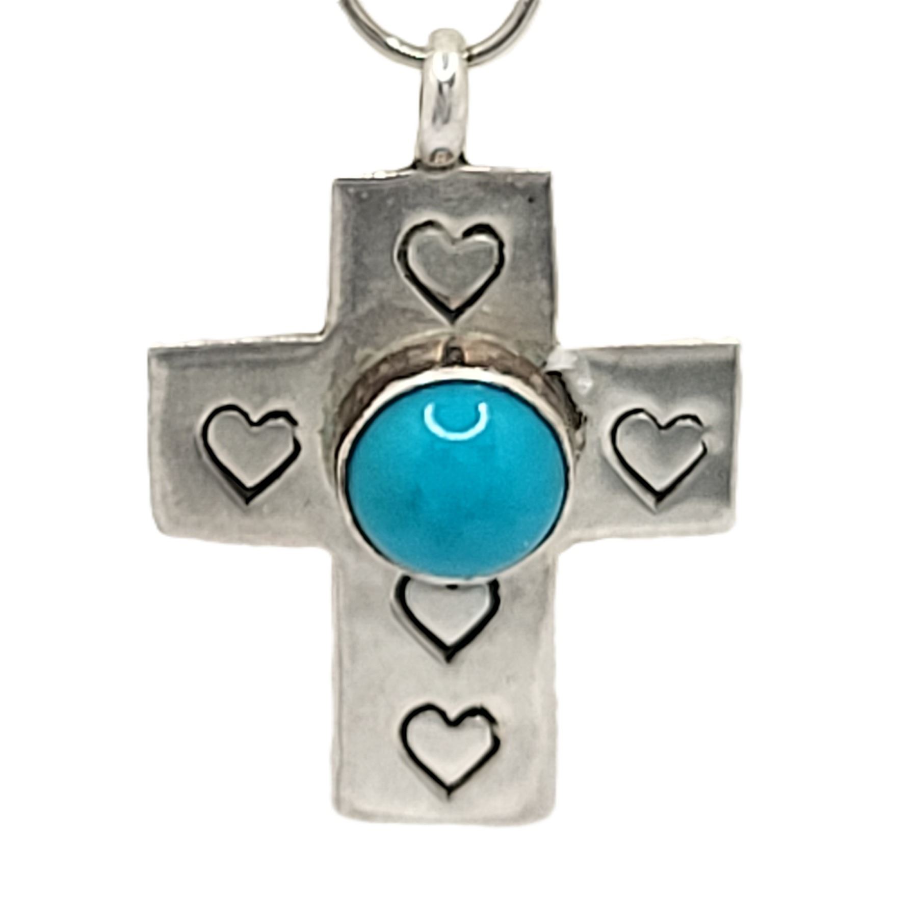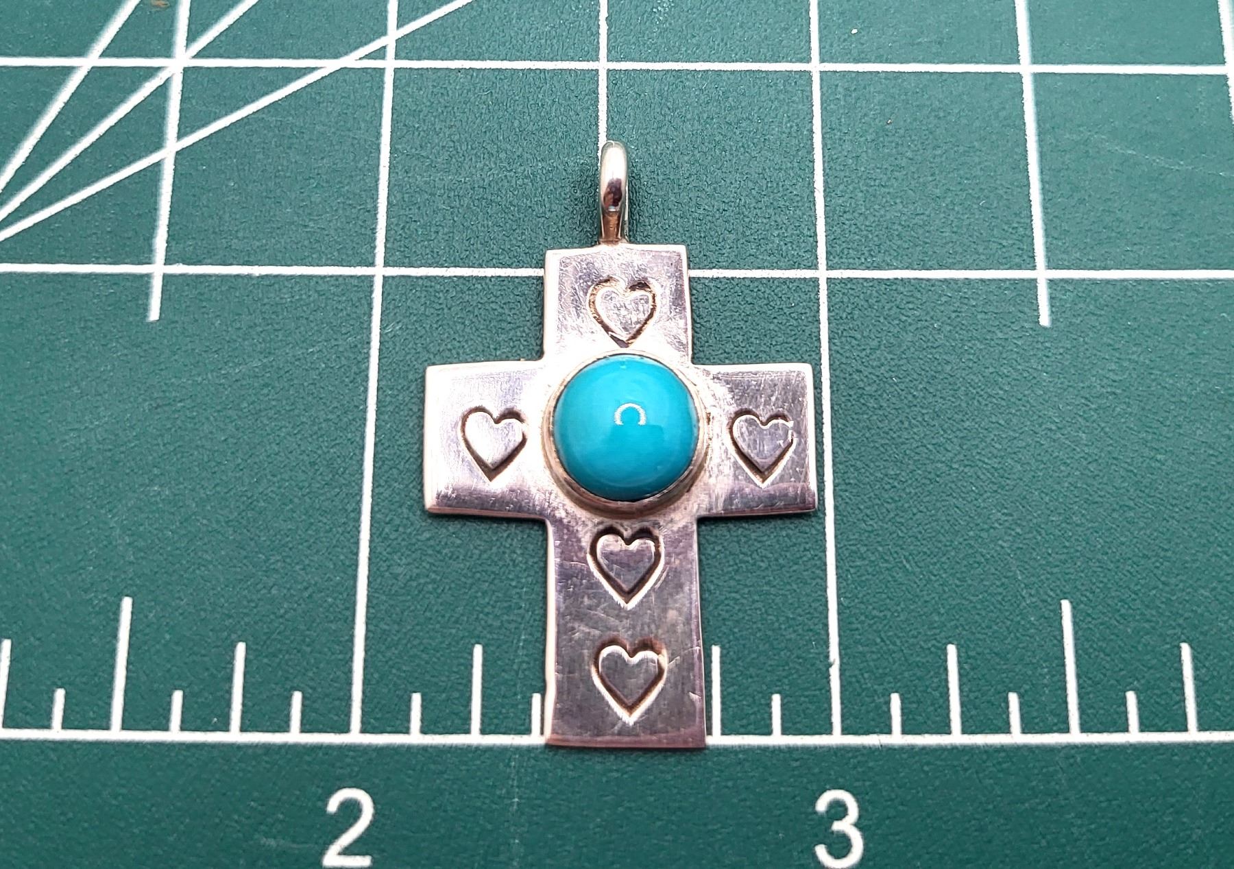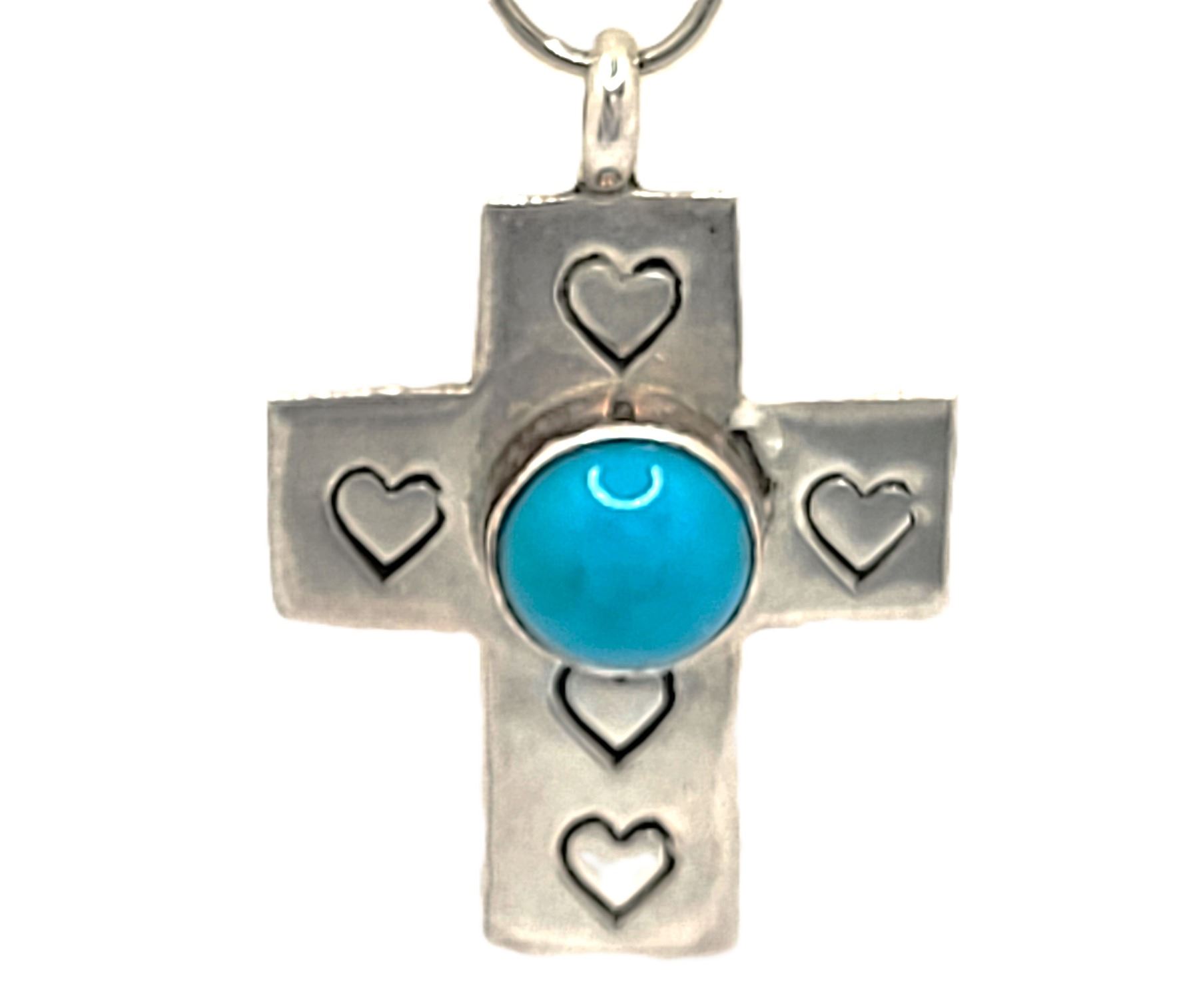 This is a signed Ruth Ann Begay, Native American Navajo, sterling silver cross that focuses on love and features an approximate 8mm cabochon, polished and stabilized Sleeping Beauty Mine Turquoise.& nbsp; The gemstone is bezel-set in the center of the cross that measures approximately 1.25& quot;x7/8& quot; with five outlined hearts.& nbsp; The cross has a permanently affixed, solid bail that can accommodate a chain up to 2.75mm wide.& nbsp; The stamp and signature are on the back of the cross.& nbsp; Admin& nbsp; 33122/12.