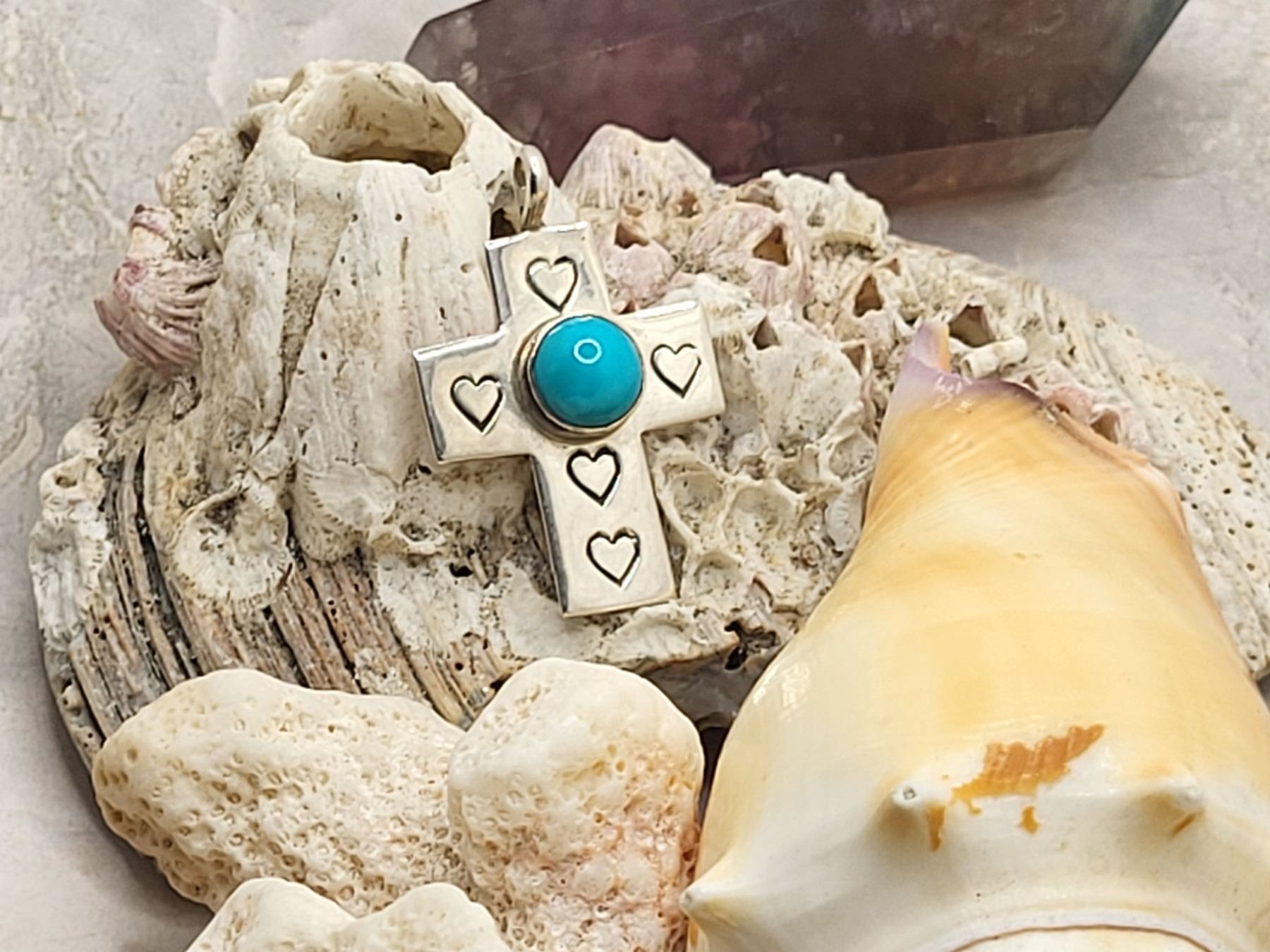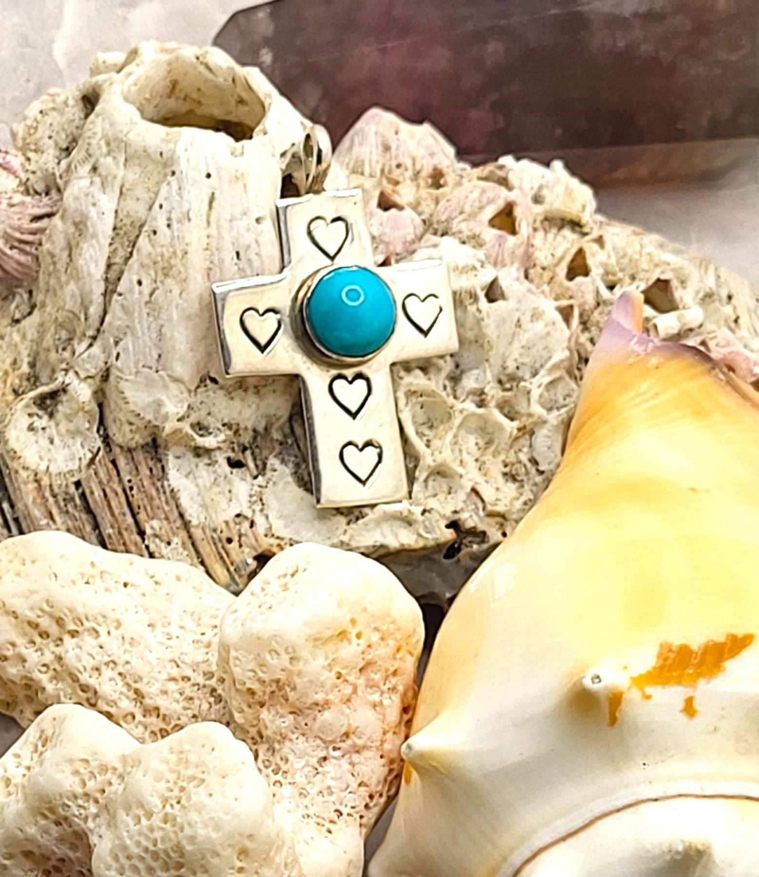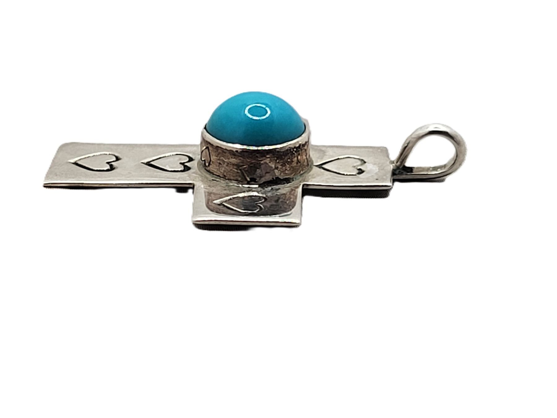 This is a signed Ruth Ann Begay, Native American Navajo, sterling silver cross that focuses on love and features an approximate 8mm cabochon, polished and stabilized Sleeping Beauty Mine Turquoise.& nbsp; The gemstone is bezel-set in the center of the cross that measures approximately 1.25& quot;x7/8& quot; with five outlined hearts.& nbsp; The cross has a permanently affixed, solid bail that can accommodate a chain up to 2.75mm wide.& nbsp; The stamp and signature are on the back of the cross.& nbsp; Admin& nbsp; 33122/12.