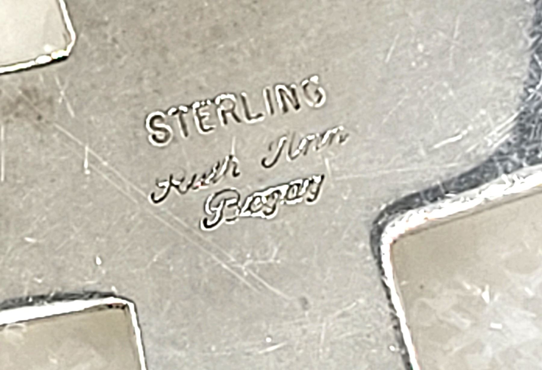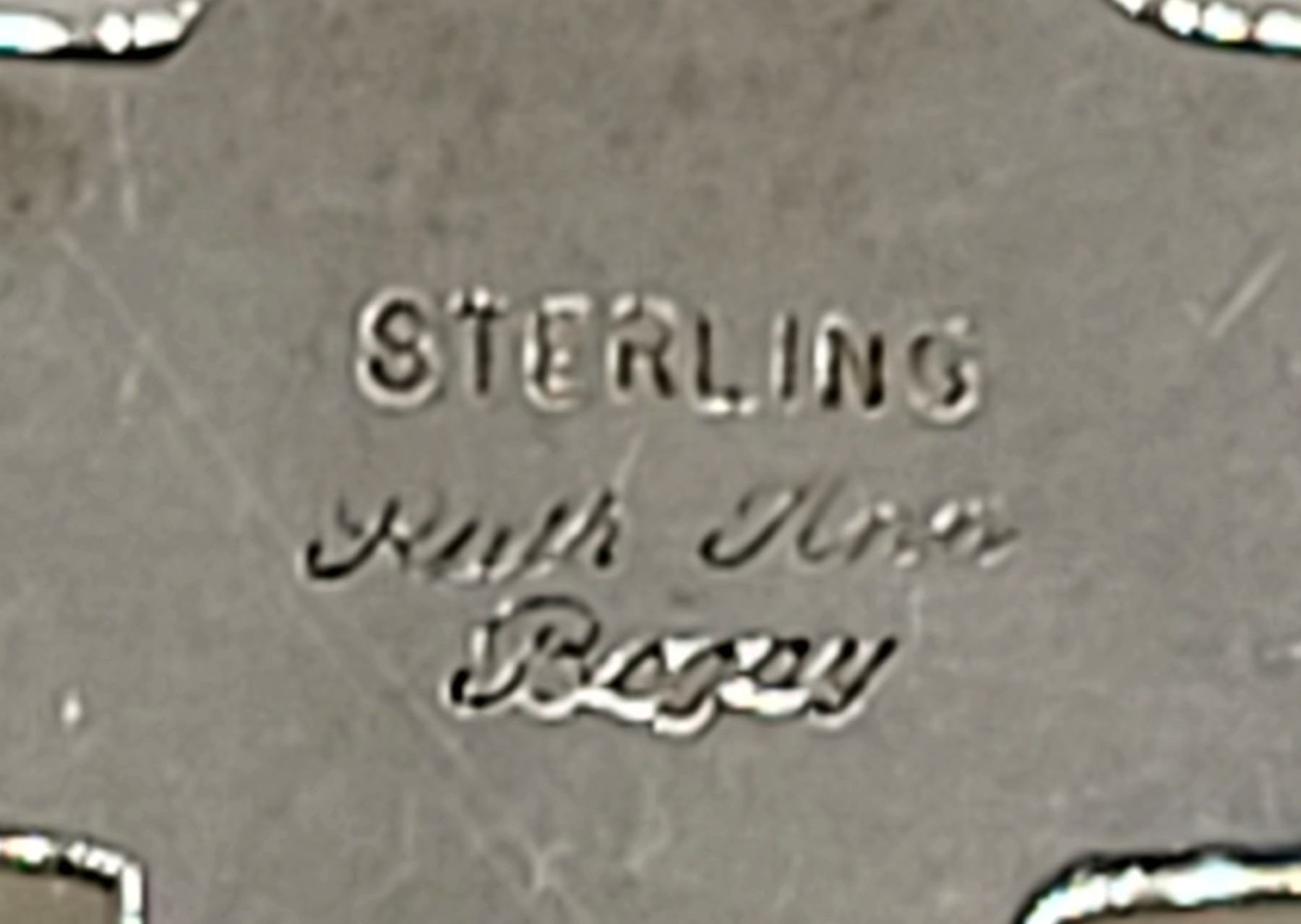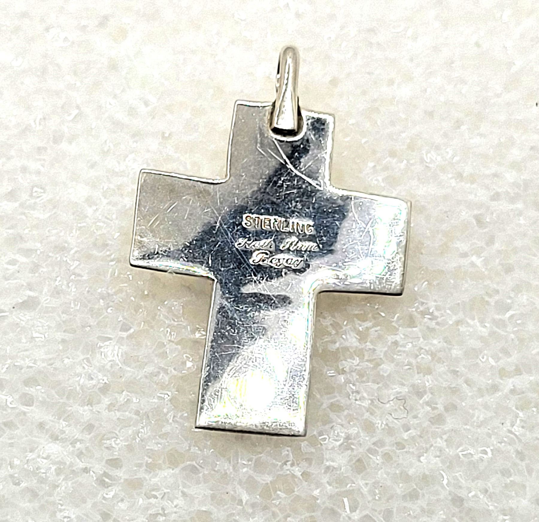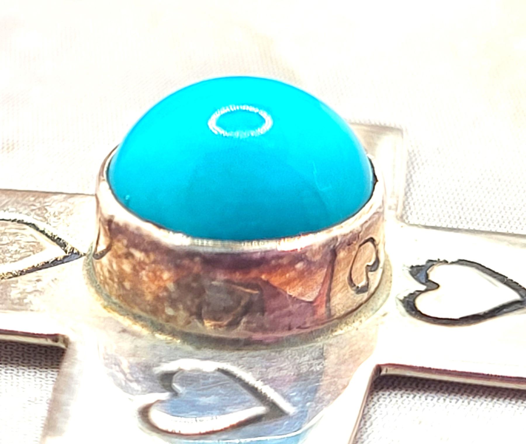 This is a signed Ruth Ann Begay, Native American Navajo, sterling silver cross that focuses on love and features an approximate 8mm cabochon, polished and stabilized Sleeping Beauty Mine Turquoise.& nbsp; The gemstone is bezel-set in the center of the cross that measures approximately 1.25& quot;x7/8& quot; with five outlined hearts.& nbsp; The cross has a permanently affixed, solid bail that can accommodate a chain up to 2.75mm wide.& nbsp; The stamp and signature are on the back of the cross.& nbsp; Admin& nbsp; 33122/12.