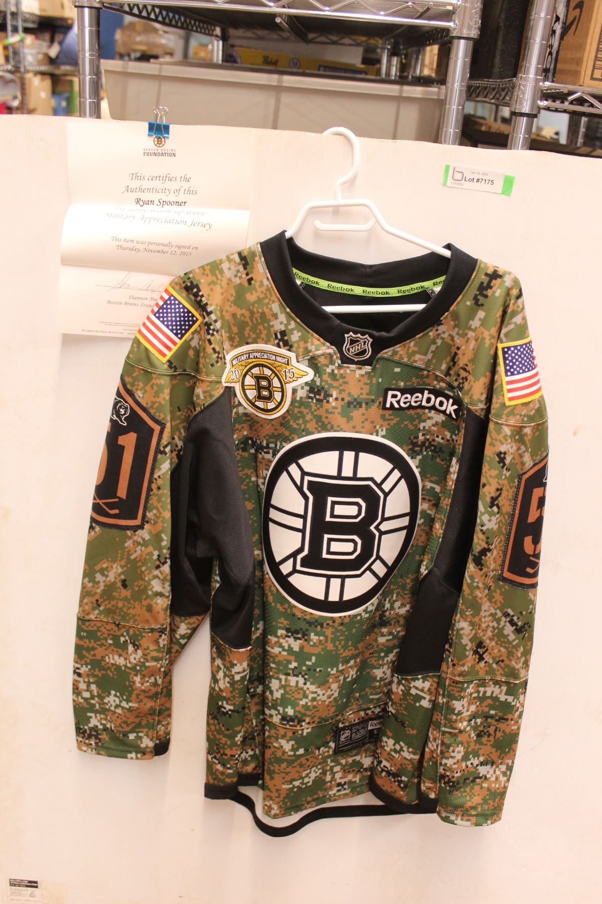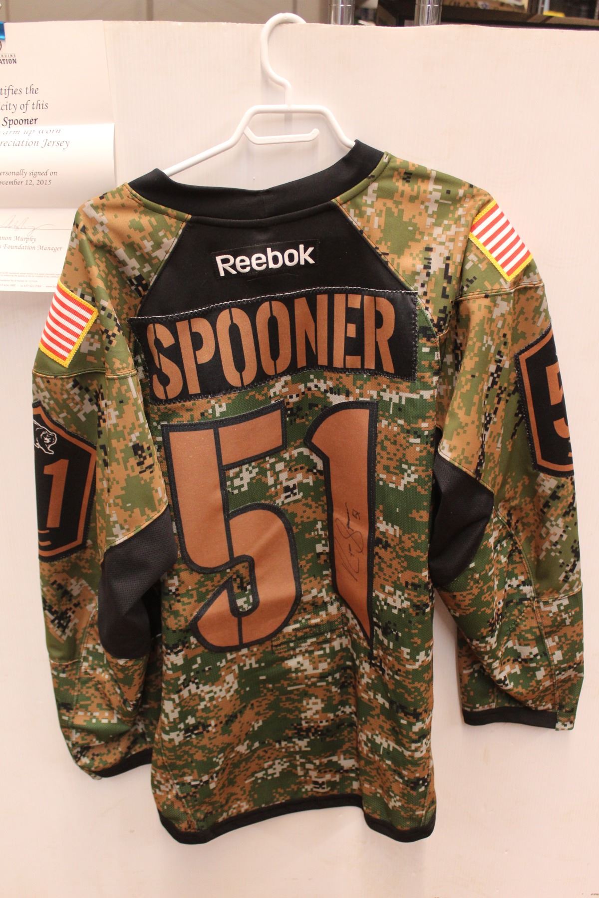 Signed Ryan Spooner Pre-Game Military Appreciation Jersey with Certificate of Authenticity - Size 56