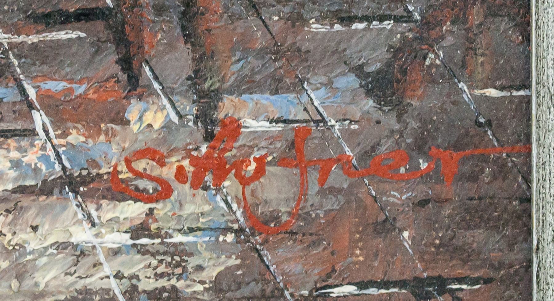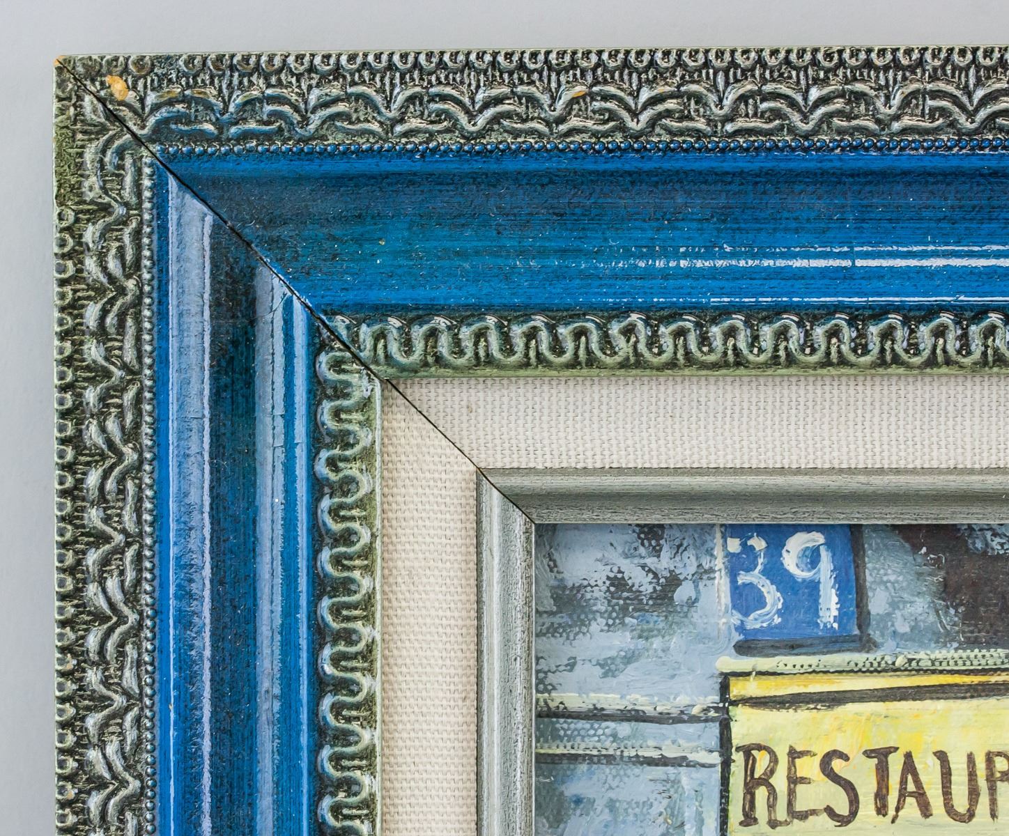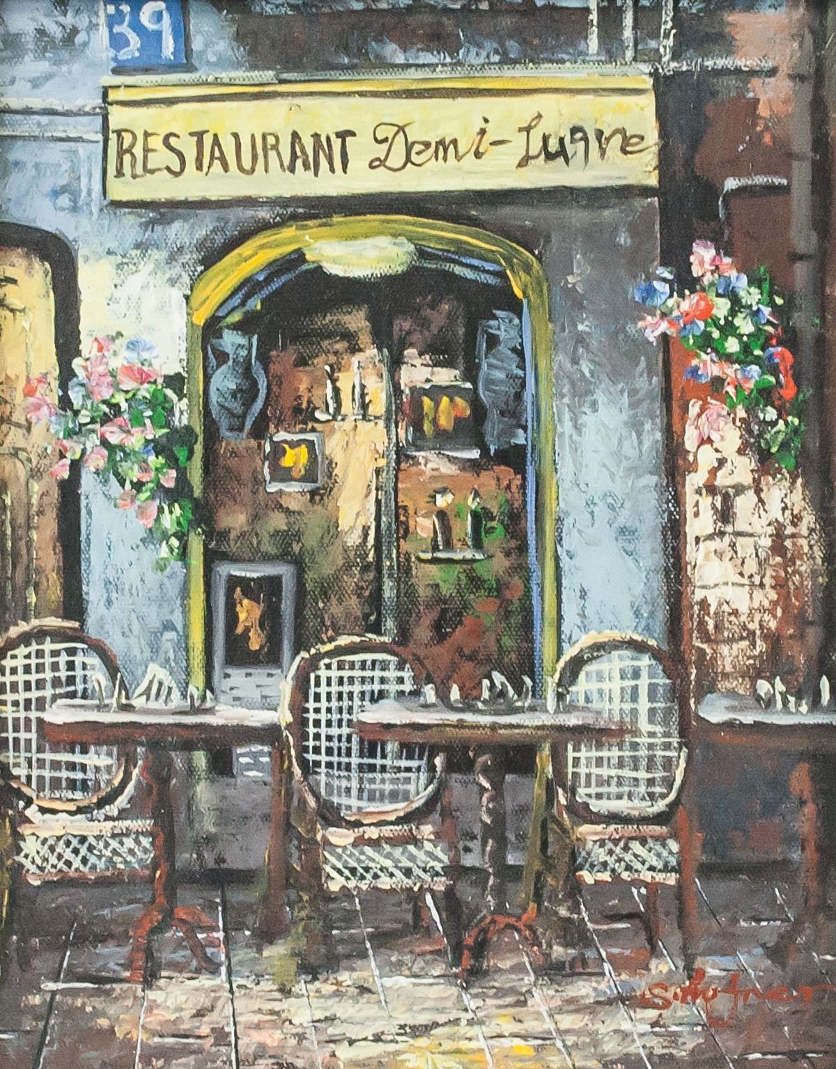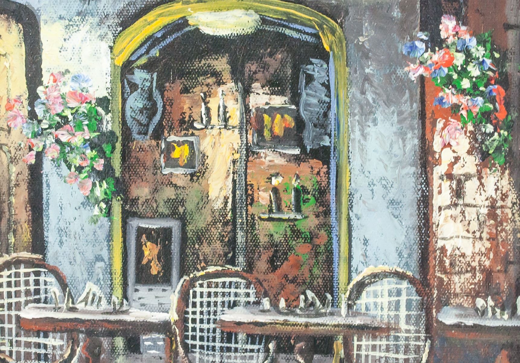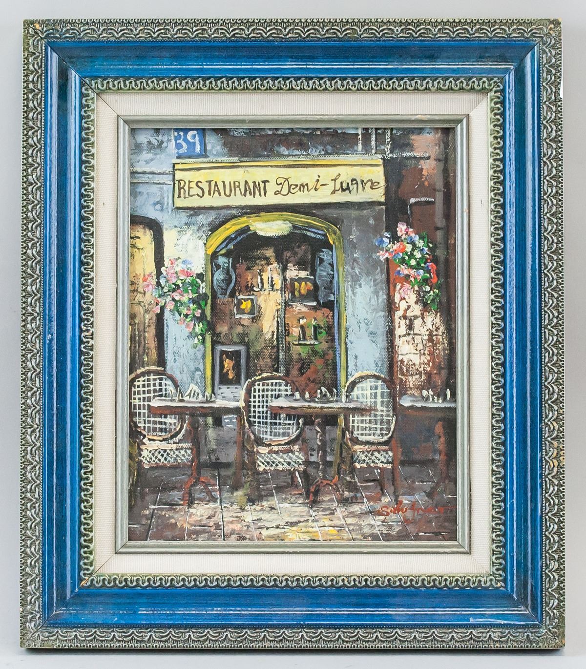 Oil on panel, framed. Depicting the front window of a restaurant and the outside seating. Signed "S. Aufret" in the bottom right corner. 25 x 19 cm (9.5 x 7.5 in), Frame: 37 x 32 cm (14.5 x 12.5 in). Provenance: Toronto estate