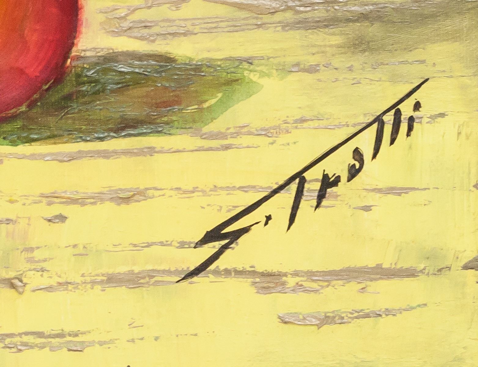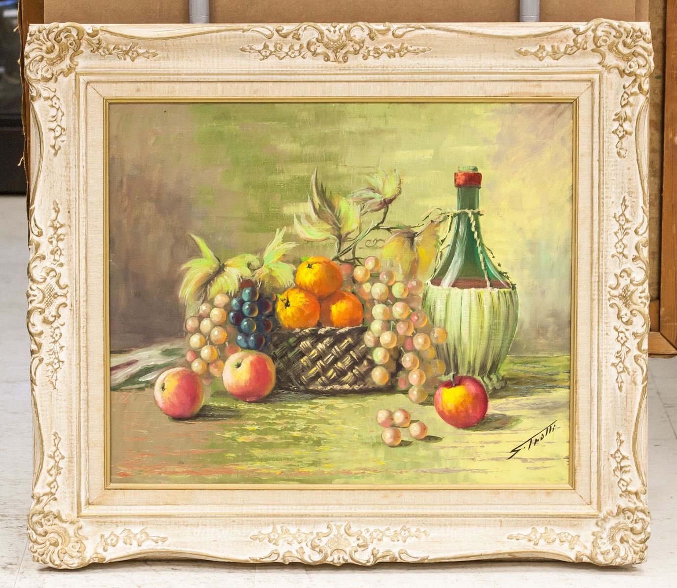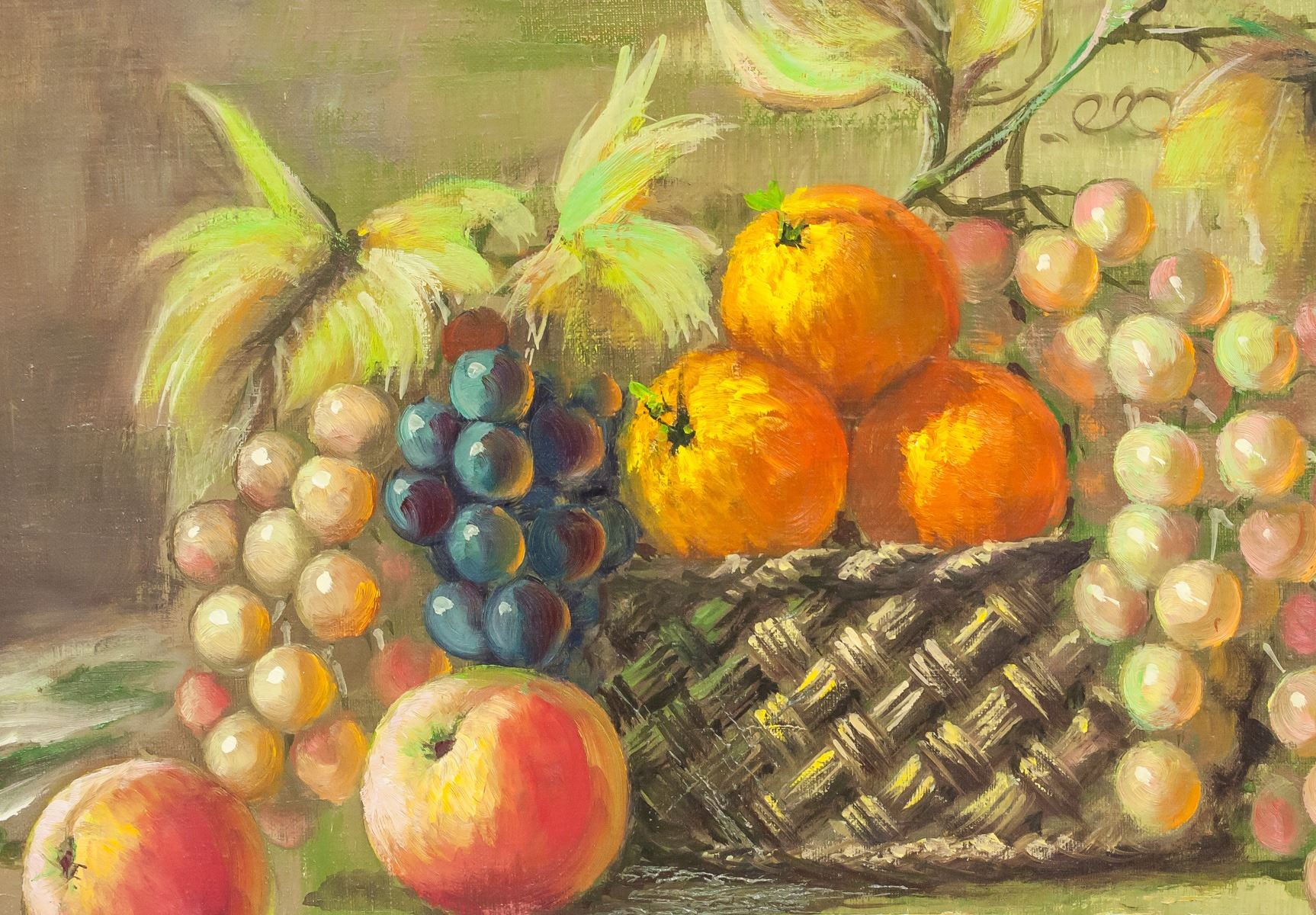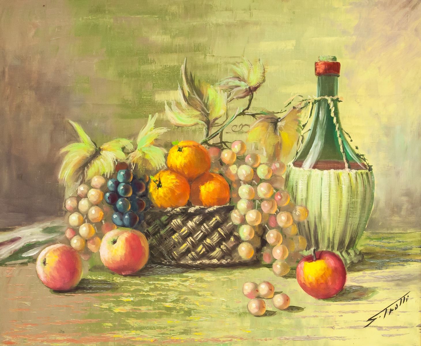 Oil on canvas, framed. Featuring still-life of fruits in a basket. Signed "S. Trolli" in the bottom right corner. "S. Trolli" inscribed on verso. 50 x 59 cm (19.75 x 23.25 inches), Frame size: 70 x 79 cm (27.5 x 31.25 inches). Provenance: Toronto estate