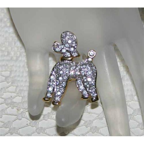 Simple and full of sparkle! This vintage 1950s figural Poodle Brooch is adorned with sparkling Pava Rhinestones in a heavy gold plated metal. Looks like the real thing by the size, sparkle and simplicity! Measuring 1 ¼ inches by 1 inch wide, securing with the original pen stem and signed SL with copyright mark.