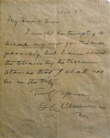 to Mr. W.A. Willar with original 2 cent envelope with Clemens embossed return address, Hartford Conn., Rare. Est. 2500-3500